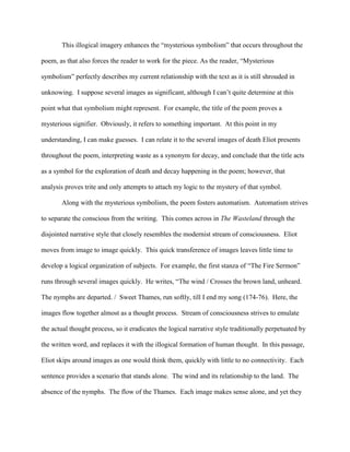The document provides an analysis of T.S. Eliot's poem "The Wasteland" through the lens of surrealism. It notes that Eliot creates irrational juxtapositions of realistic images, like describing winter keeping people warm through forgetful snow. This challenges readers by not following logical expectations. Eliot also uses mysterious symbolism, like the title "The Wasteland," that the reader must work to interpret. Additionally, the disjointed narrative style resembles stream of consciousness writing, moving quickly between images with little connectivity, mimicking human thought processes. These surreal techniques make the poem difficult for readers to follow rationally and require assessing it on its own terms.