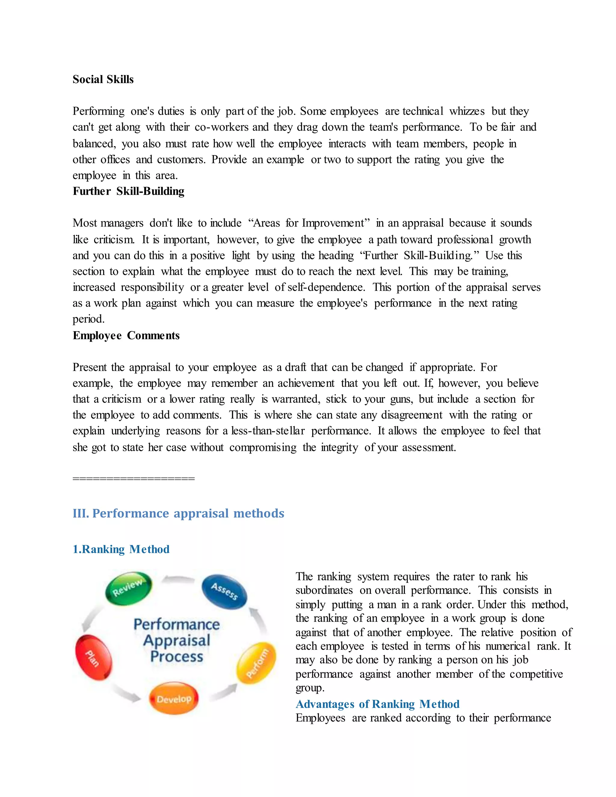 The document provides an overview of performance appraisals, including methods, preparation tips, and criteria for assessing employee performance. It emphasizes the importance of honest evaluations that differentiate between strong and weak performers, as well as offering opportunities for professional growth. Various appraisal methods are discussed, including ranking, rating scale, checklist, critical incidents, essay method, and behaviorally anchored rating scales, each with its advantages and limitations.