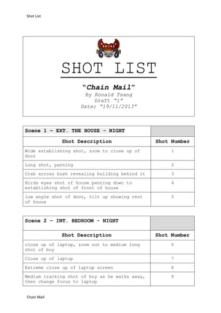 The shot list contains 30 shots organized into two scenes for the short film "Chain Mail". Scene 1 takes place outside the house and includes wide establishing shots zooming into the front door, as well as low angle and panning shots. Scene 2 is set inside the bedroom and features various shots of a boy on a laptop, including close-ups of the laptop screen, medium shots as the boy walks away, and shots zooming between the boy and laptop. It also includes point-of-view shots from inside a closet or cuboard, tracking shots as a character walks through the house, and high angle shots looking down the staircase.