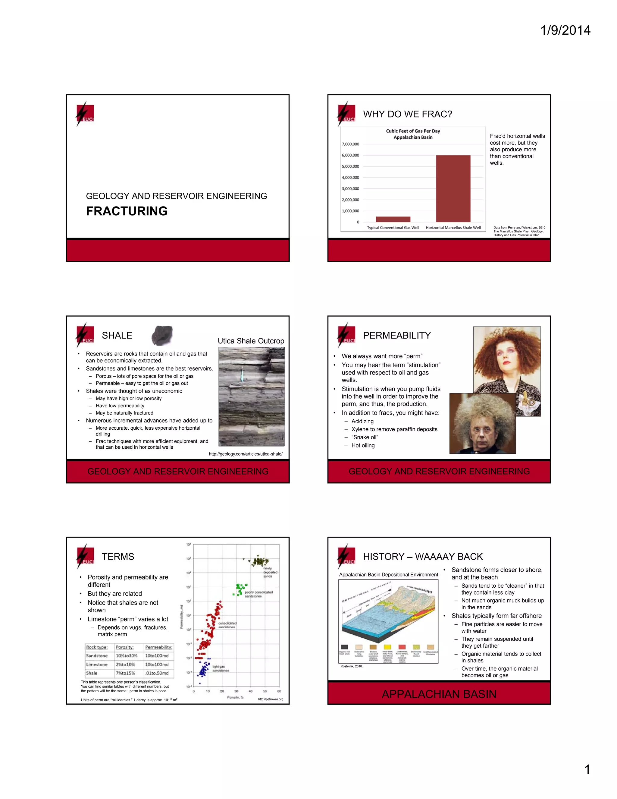 The document discusses the role of hydraulic fracturing in enhancing oil and gas production in horizontal wells, particularly in the context of the Marcellus shale play. It explains the geological characteristics of reservoirs, emphasizing the significance of porosity and permeability, and outlines historical developments in drilling techniques and fracturing methods. Additionally, it touches upon the classification of shale's permeability and the importance of understanding rock properties for effective frac design.