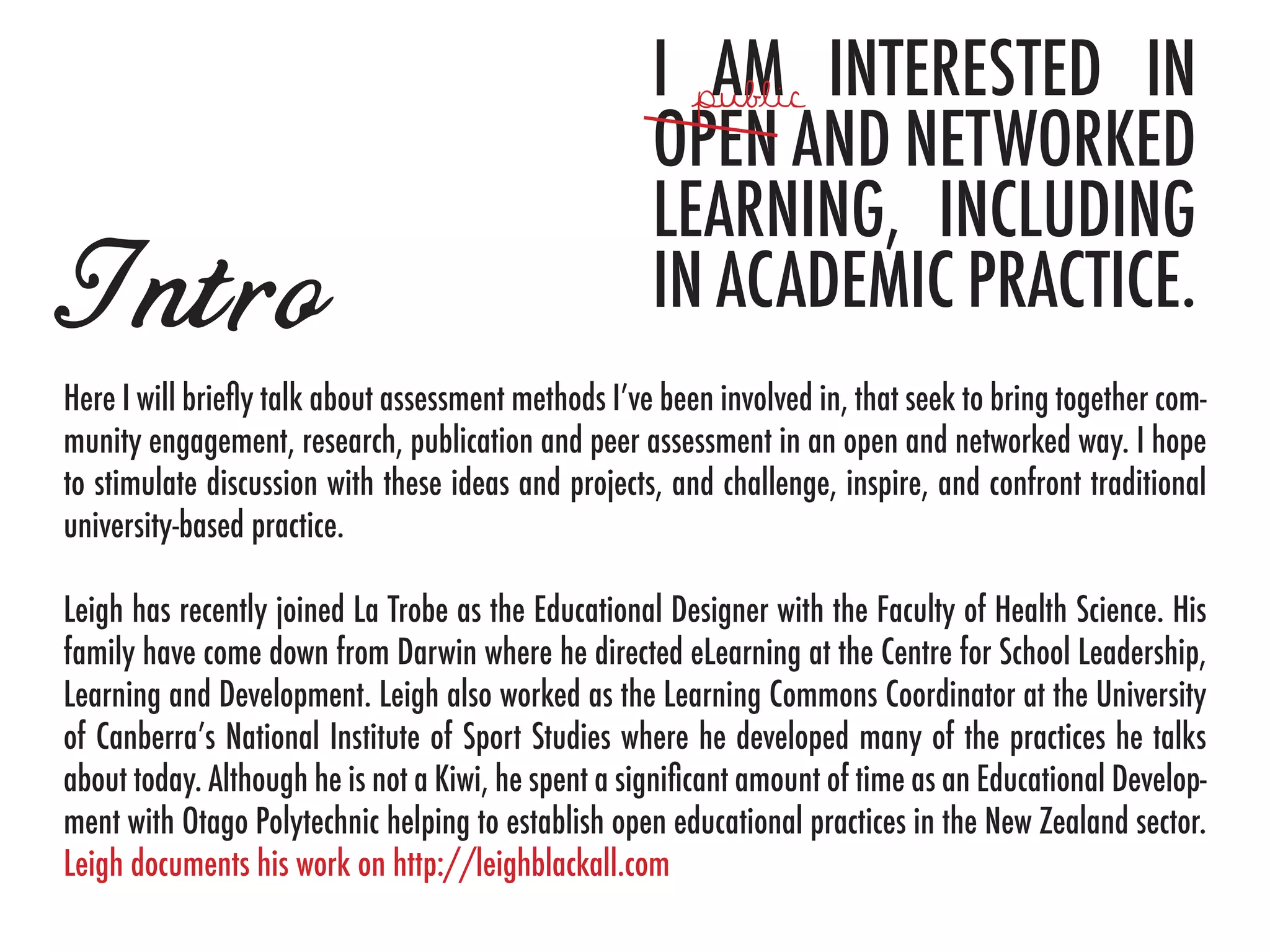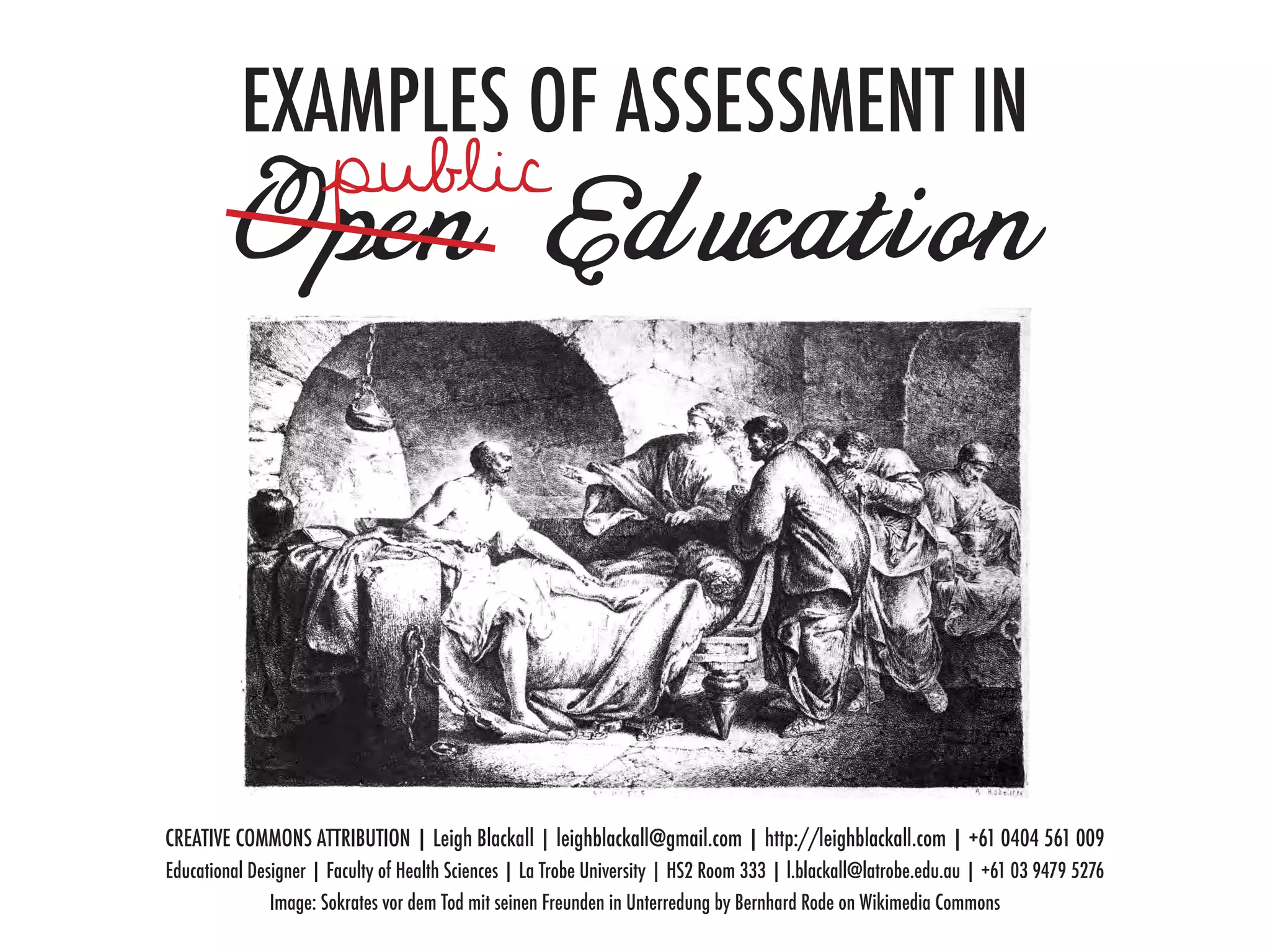 The document discusses examples of assessment methods in open education that seek to bring together community engagement, research, publication, and peer assessment in an open and networked way. Three examples are provided: 1) A psychology student-authored open textbook where an essay assignment was changed to writing a textbook chapter. 2) A sport studies course where assignments were published papers in a student journal, presentations were screen-based, and exams were open-book. 3) A journalism course where an assignment was to get a story published on Wikinews to pass. The document concludes with principles of practice for this type of assessment and suggestions for further applications.