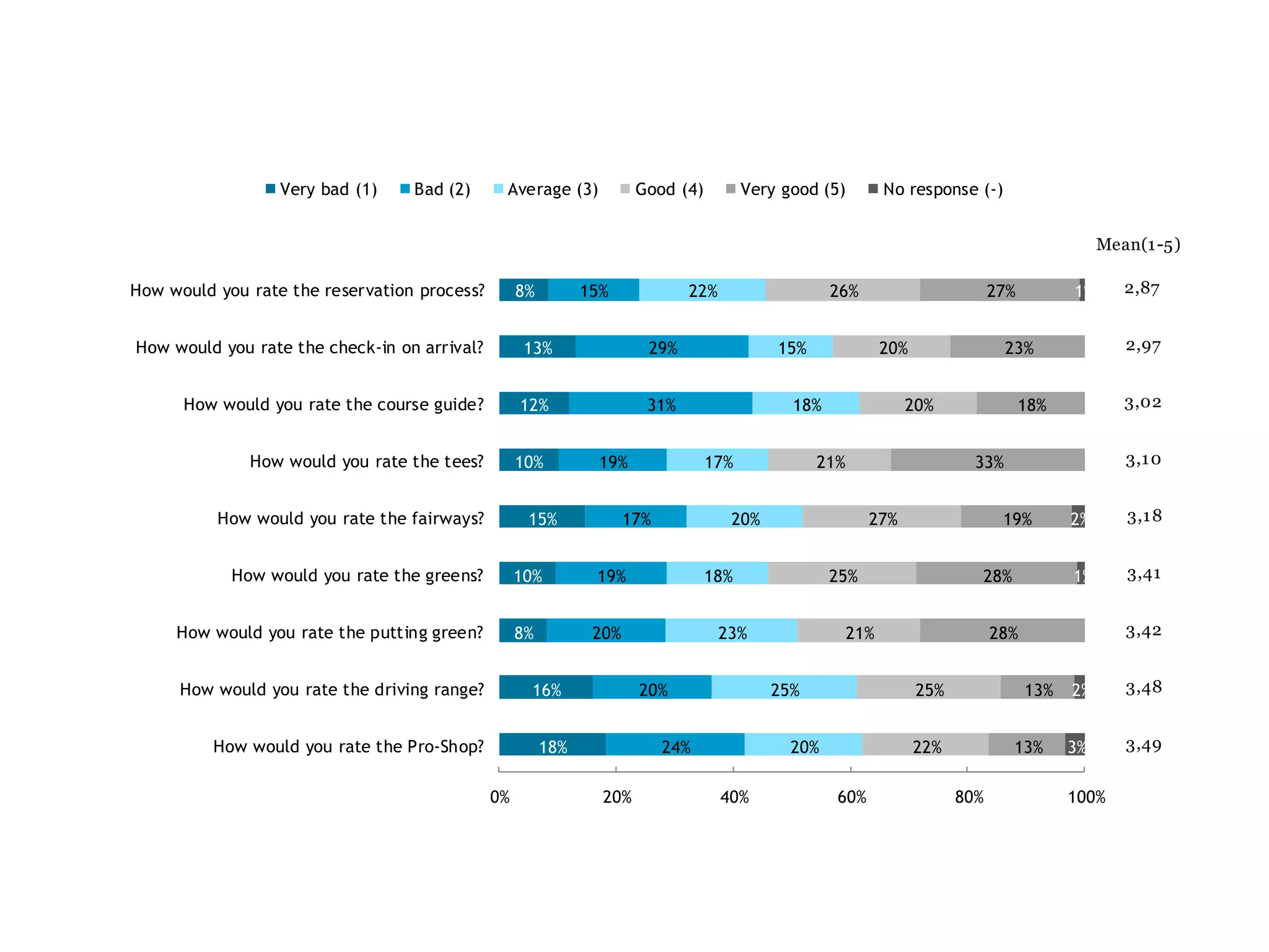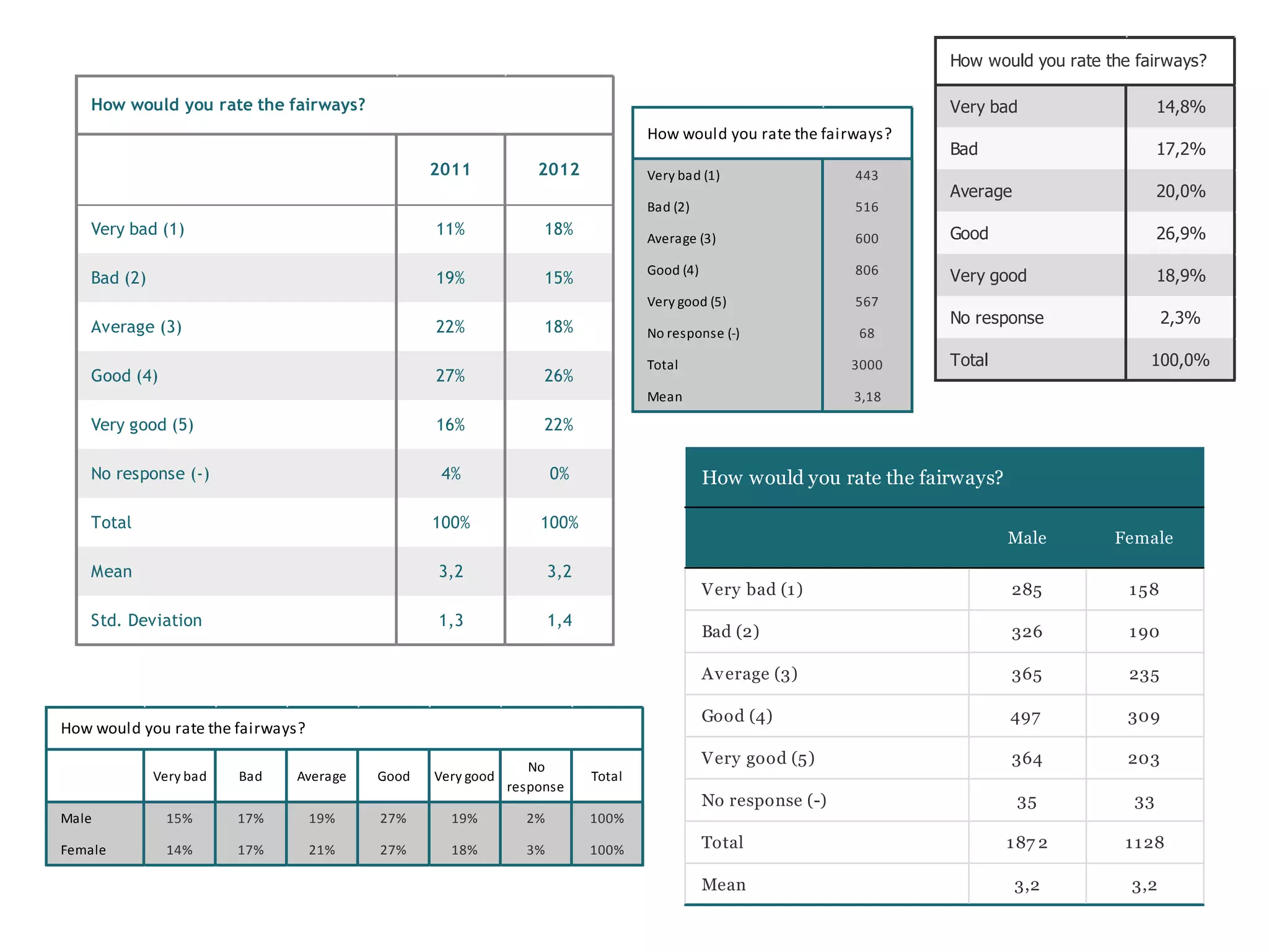 The document contains several charts and crosstabs summarizing survey results about ratings of golf course elements like fairways, greens, and customer service. The charts show ratings from 2011-2013 and breakdowns by gender and quarter. Most elements were rated average (3) or good (4) on a 5-point scale. Fairways received a mean rating of 3.18 overall with similar ratings between genders. Awareness and consideration of the golf course remained steady from 2012-2013 while occasional and frequent use declined slightly.