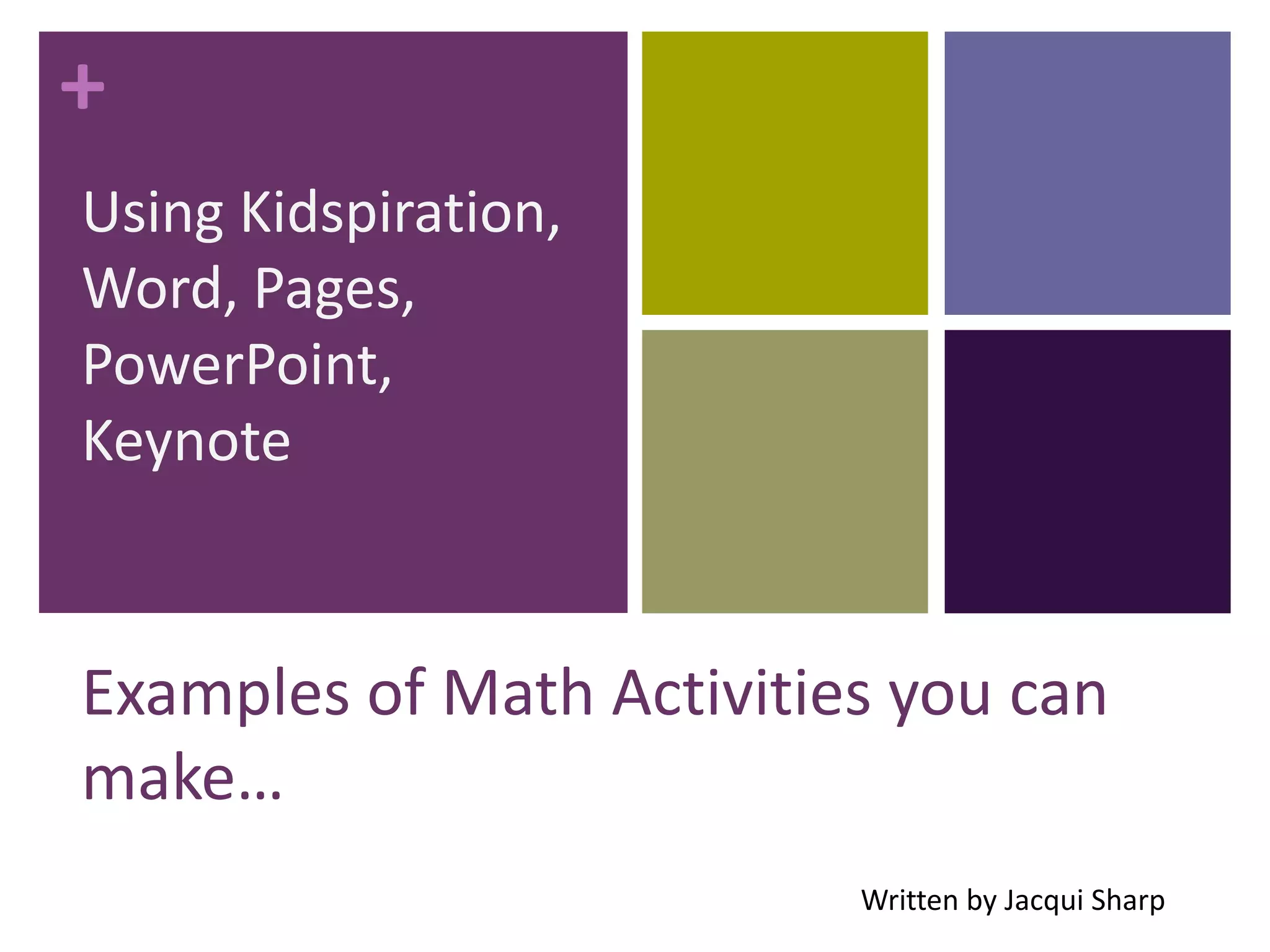 Using various software programs like Kidspiration, Word, Pages, PowerPoint, and Keynote, this document provides examples of math activities that can be created such as diagrams and graphs using Kidspiration, slideshows with math problems and solutions using PowerPoint or Keynote, and math coloring pages using Kidpix. Kidspiration is mentioned most often as a tool that can be used to make different math-related projects.