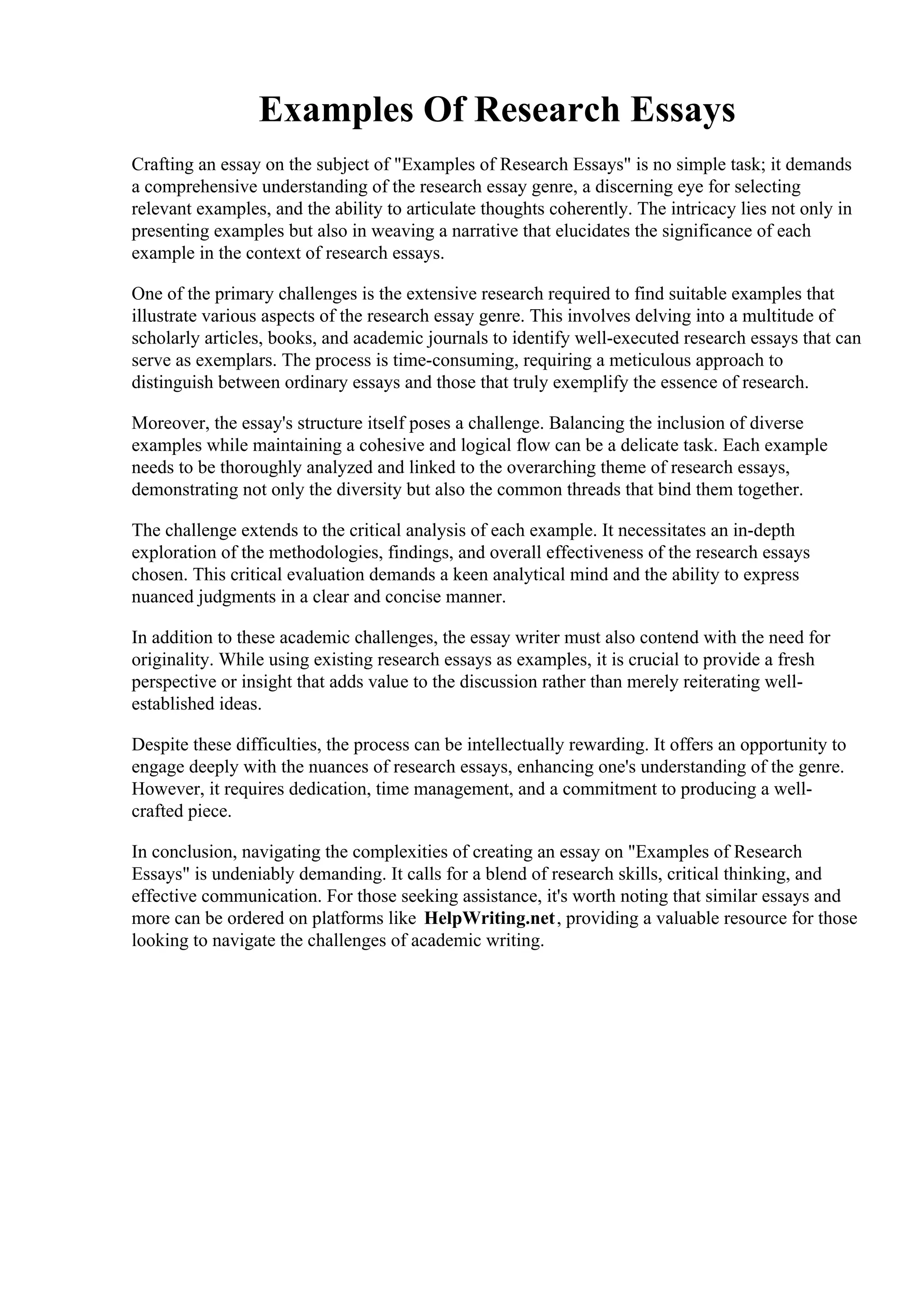 The document discusses the complexity of crafting an essay about 'examples of research essays,' emphasizing the need for extensive research, critical analysis, and originality. It highlights the difficulties in selecting appropriate examples and structuring the essay coherently while requiring clear expressions of thought. Additionally, it notes the potential resources available for those seeking assistance with academic writing.