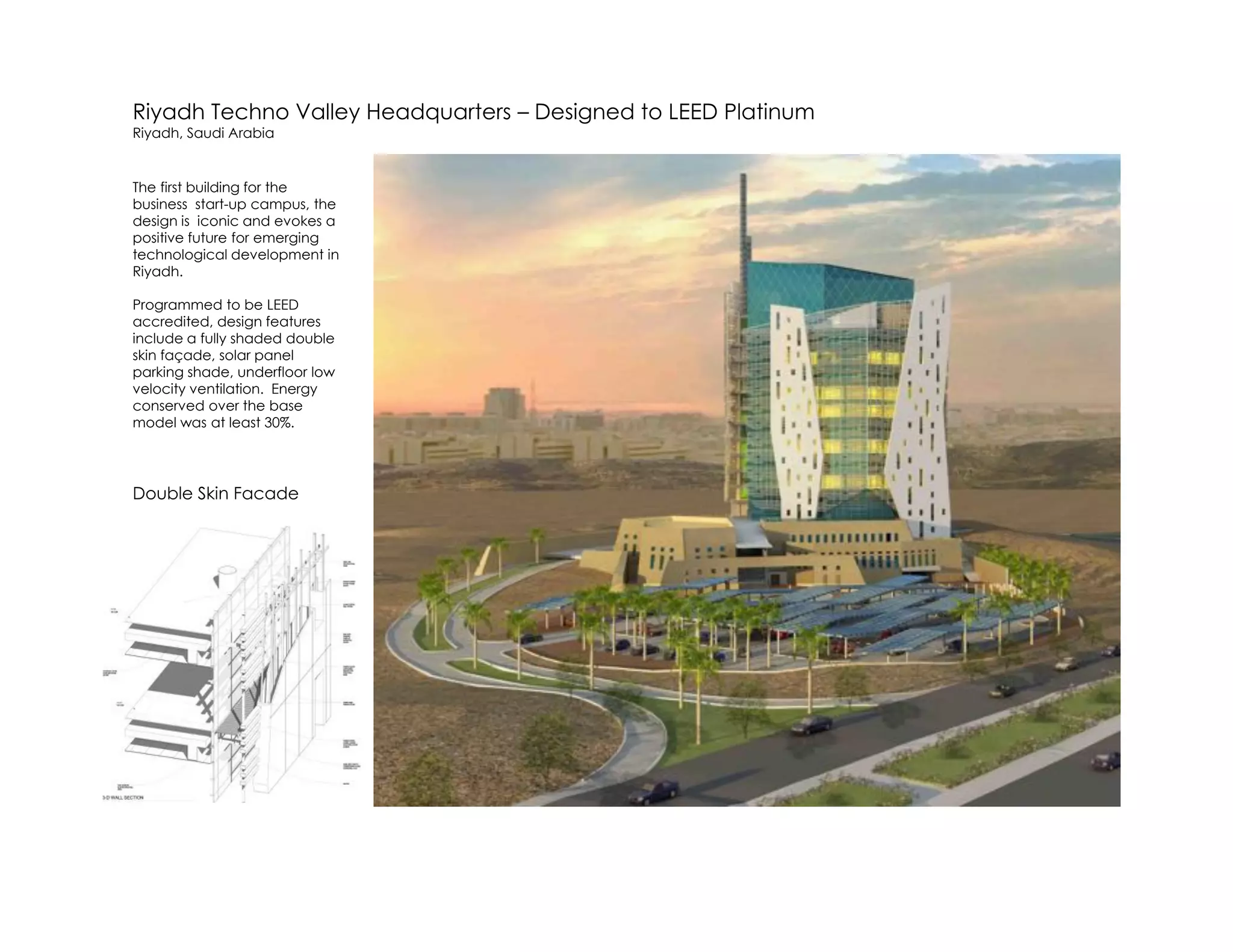 This document provides descriptions of various building projects designed by John P. Holland, AIA. It includes projects in Saudi Arabia, Dubai, Philadelphia, Qatar, the UK and New Jersey ranging from commercial high-rises, residential towers, office buildings, hospitals, museums and sustainable homes. The projects utilize designs focused on sustainability and energy efficiency like double skin facades, solar panels and high levels of insulation. They also incorporate unique architectural features and programs tailored to their specific uses and locations.