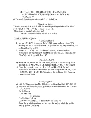 The document provides examples of classifying soils using the AASHTO and USCS soil classification systems. Key steps include determining the particle size distribution, plasticity characteristics (liquid limit, plastic limit, plasticity index), and using this data on classification charts to identify the appropriate soil type symbols. Soils are classified as sand, silt, clay or combinations based on their grain size and plasticity properties.