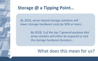 The document discusses emerging trends in storage architectures and technologies. By 2016, server-based storage solutions will lower hardware costs by 50% due to consolidation. Three of the top seven disk array vendors will exit the hardware business by 2018. New storage architectures are designed for web-scale, multi-tenancy, high access, and resilience needs. Open source software-defined storage solutions like Nutanix and Gluster address these needs through distributed, scalable designs. Emerging workload-based architectures require assessing specific requirements to determine the optimal solution.