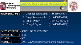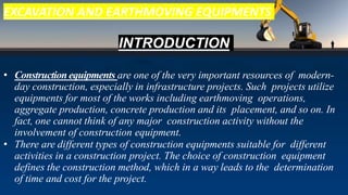 This document discusses various types of earthmoving equipment used in construction projects including their uses and basic parts. It describes excavating equipment like power shovels, backhoes, draglines, clam shells, and trenchers. It also covers earthmoving equipment like scrapers, bulldozers, dumpers, graders, and loaders. For each type of equipment, it provides details on their applications and functions in excavating, transporting, and grading earth.