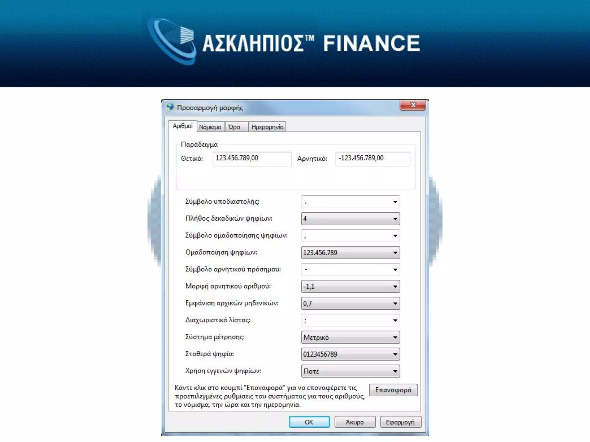 ως εξής: Σύμβολο Υποδιαστολής . Πλήθος Δεκαδικών Ψηφίων 4 Σύμβολο Ομαδοποίησης Ψηφίων ,