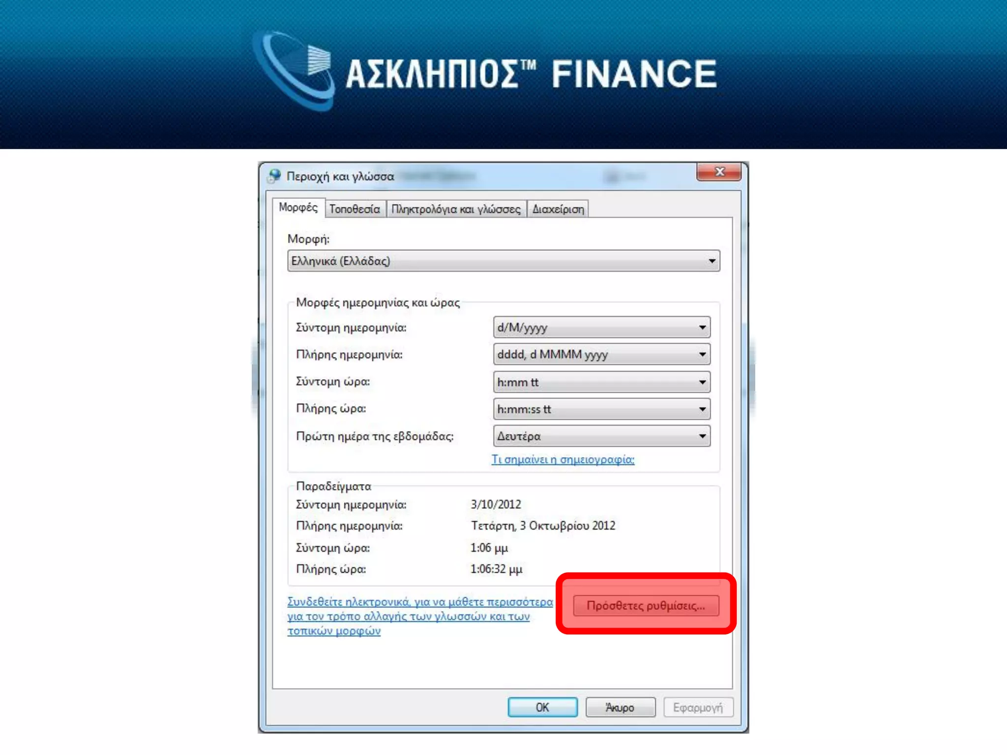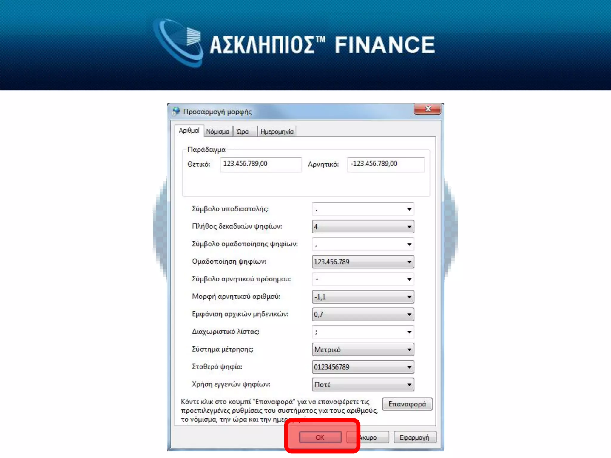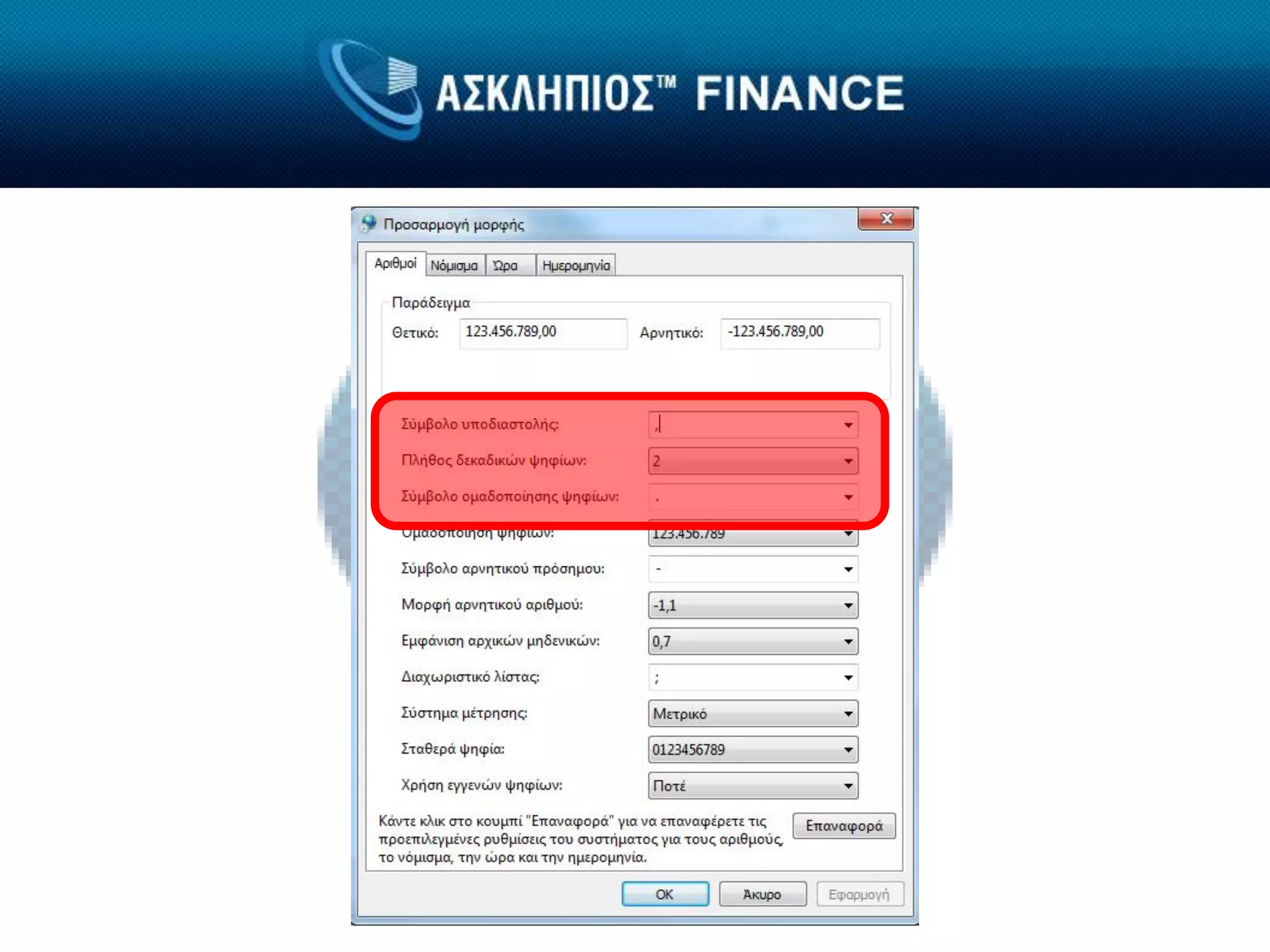 παράθυρο που θα εμφανιστεί μας ενδιαφέρουν τα πεδία “Σύμβολο Υποδιαστολής”, ”Πλήθος Δεκαδικών Ψηφίων” και “Σύμβολο Ομαδοποίησης Ψηφίων”