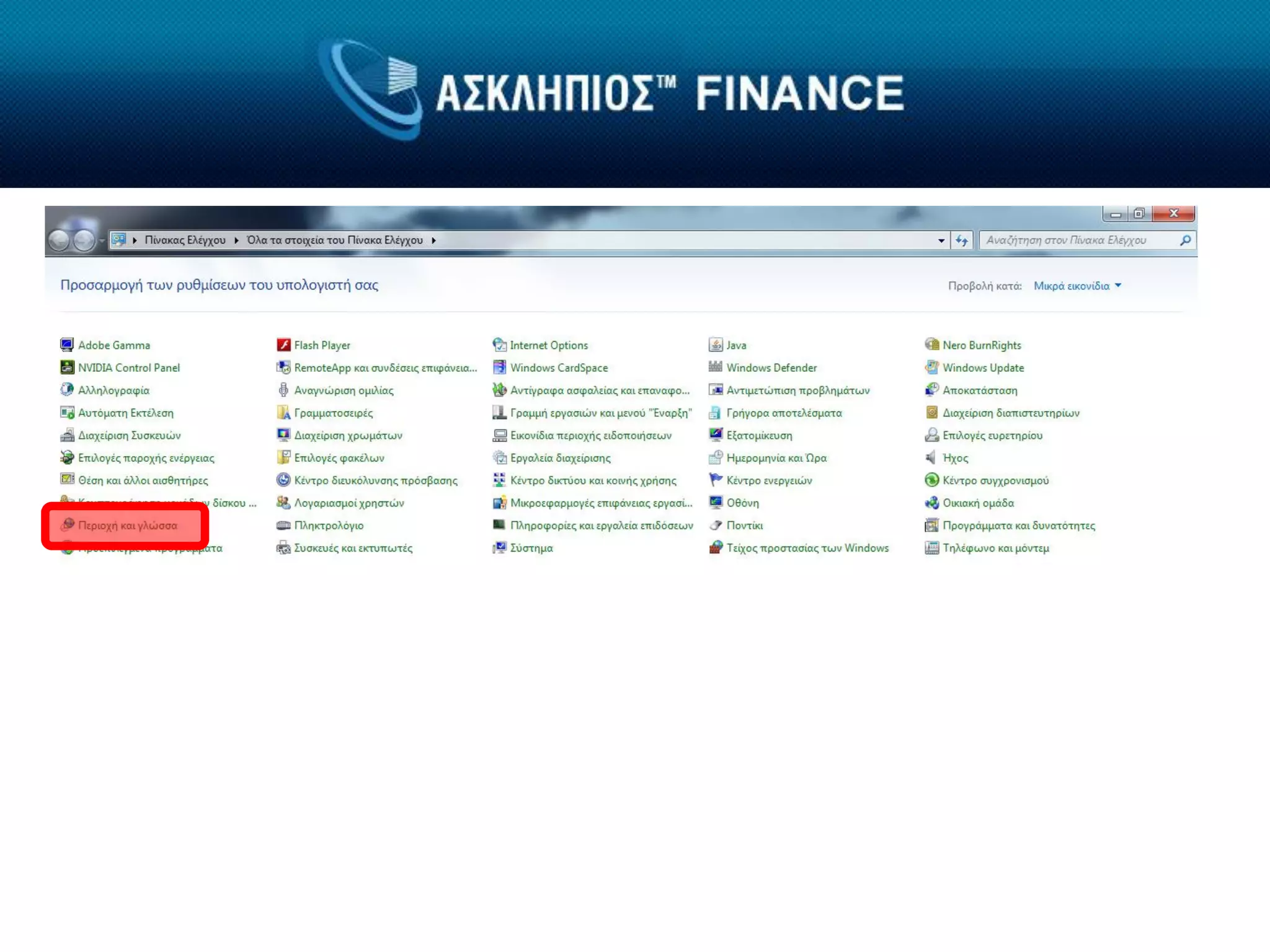 ελέγχου, κάνουμε κλικ στην επιλογή “Περιοχή Και Γλώσσα”
