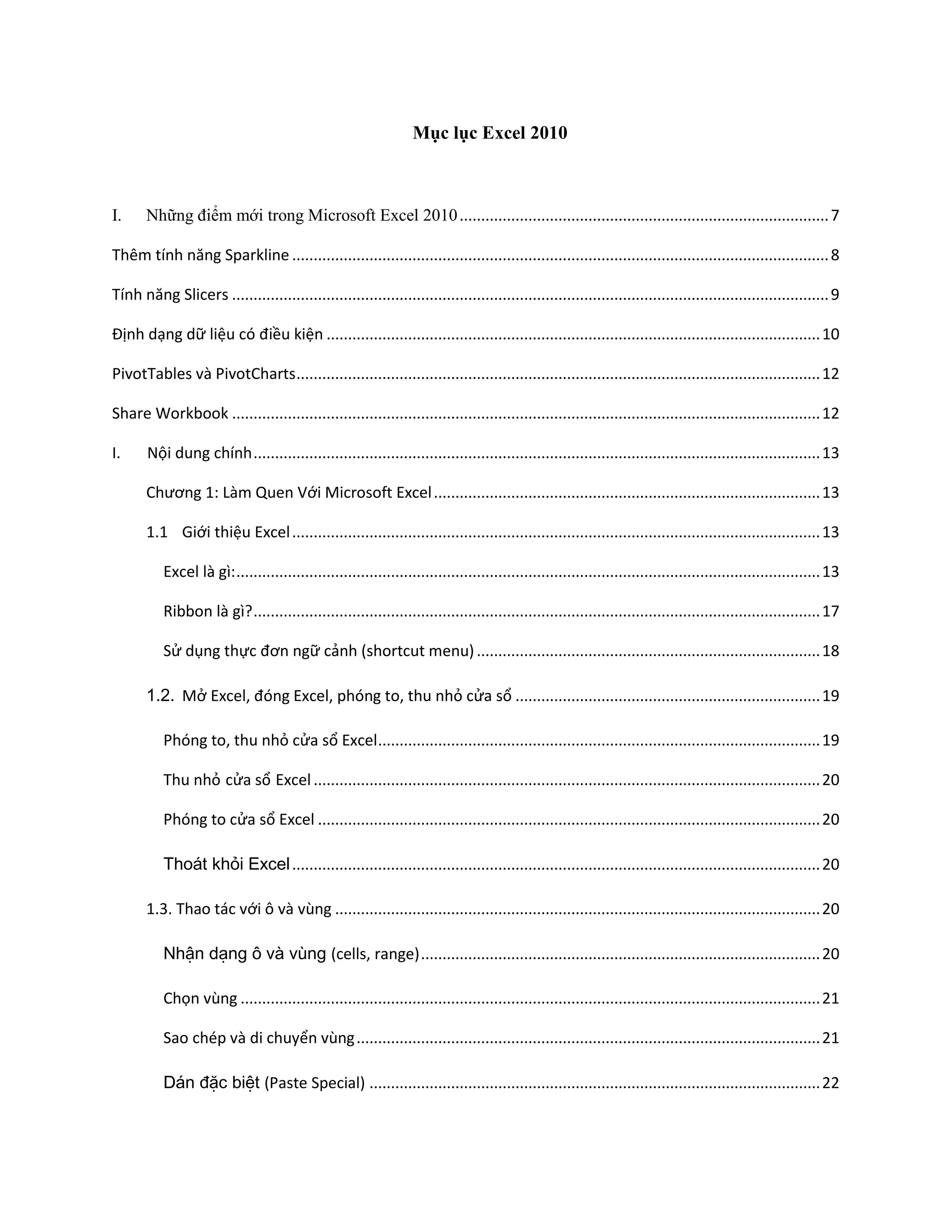 Tài liệu cung cấp hướng dẫn chi tiết về Microsoft Excel 2010, bao gồm các tính năng mới như sparkline, slicers, và định dạng dữ liệu có điều kiện. Nó cũng giải thích cách làm quen với môi trường làm việc, thao tác với các ô và workbook, cùng với các công thức, hàm, và cách tạo báo cáo với pivot tables và charts. Nội dung được tổ chức thành các chương cụ thể, giúp người dùng dễ dàng tìm hiểu và áp dụng các kỹ năng trong Excel.