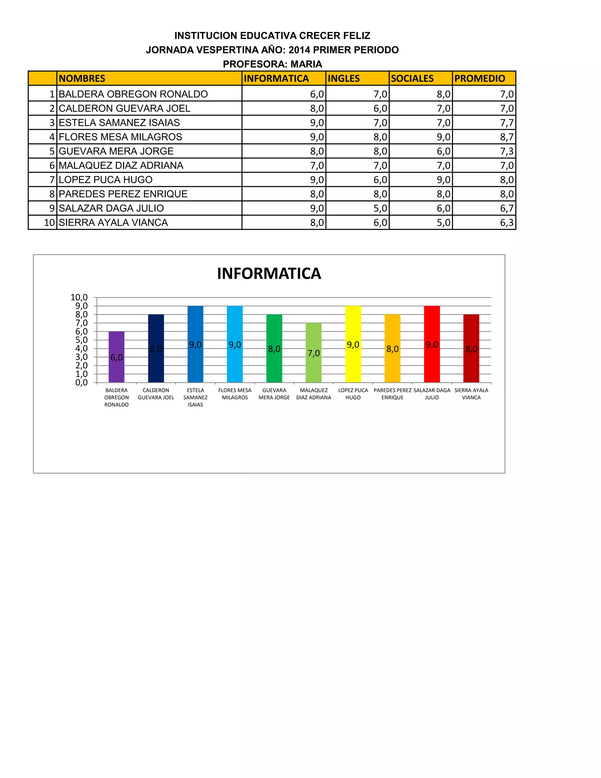 This document contains data from a school including students' names, scores in different subjects (Computing, English, Social Studies), average scores, and the teacher's name. It also includes two charts, one showing the number of didactic resources and teaching strategies used by grade level, and another indicating the elements teachers find most difficult to develop in educational planning.