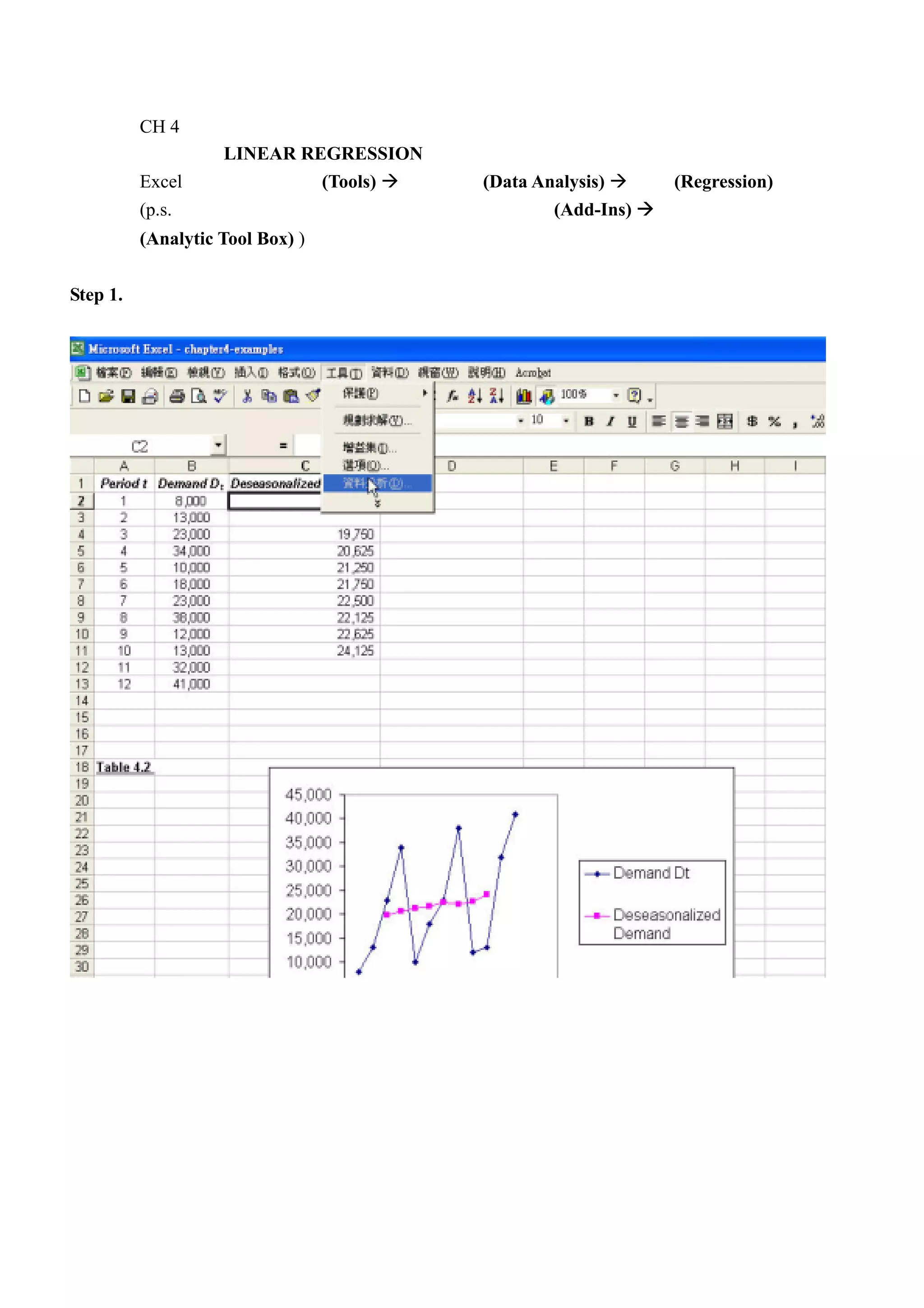 線性迴歸 LINEAR REGRESSION Excel 步驟:選取工具(Tools) 資料分析(Data Analysis) 迴歸(Regression) (p.s. 如果找不到資料分析請在工具列中選取增益集(Add-Ins) 分析工具 (Analytic Tool Box) ) Step 1.