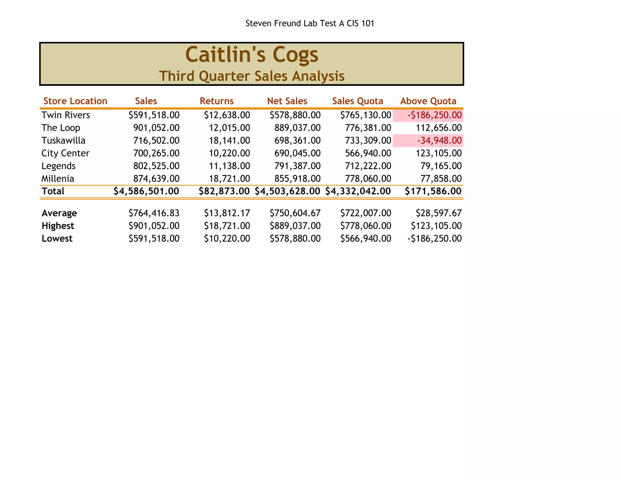 This document contains sales data from six store locations for a company, listing the store location, total sales, sales returns, net sales, sales quota, and amount above or below the sales quota. It also includes totals, averages, and highest and lowest values across the six stores. The overall totals show that while the company had over $4.5 million in net sales, it was around $171,000 above its total sales quota for the six stores.