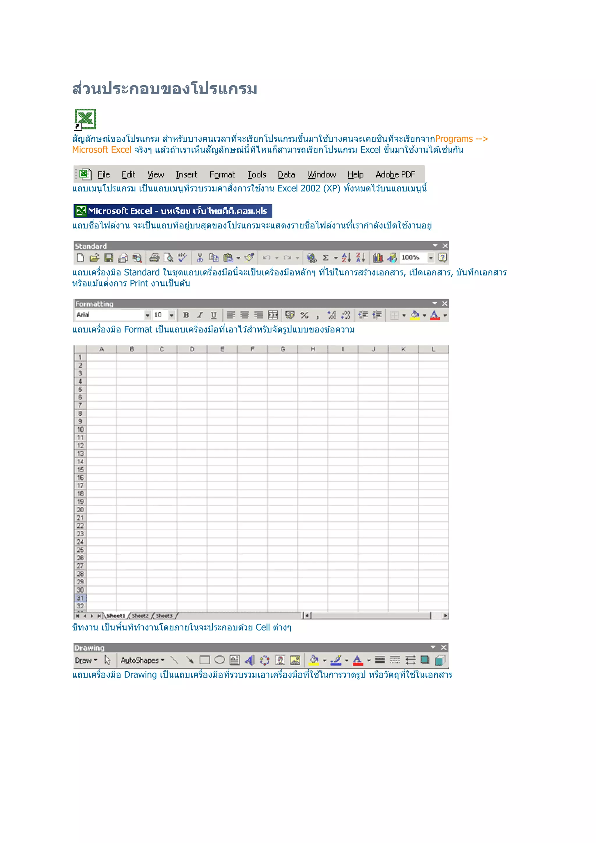 --> Microsoft Excel จริงๆ แล ้วถ ้าเราเห็นสัญลักษณ์นทีไหนก็สามารถเรียกโปรแกรม Excel ขึนมาใช ้งานได ้เช่นกัน ี แถบเมนูโปรแกรม เป็ นแถบเมนูทรวบรวมคําสังการใช ้งาน Excel 2002 (XP) ทังหมดไว ้บนแถบเมนูนี ี แถบชือไฟล์งาน จะเป็ นแถบทีอยูบนสุดของโปรแกรมจะแสดงรายชือไฟล์งานทีเรากําลังเปิ ดใช ้งานอยู่ ่ แถบเครืองมือ Standard ในชุดแถบเครืองมือนีจะเป็ นเครืองมือหลักๆ ทีใช ้ในการสร ้างเอกสาร, เปิ ดเอกสาร, บันทึกเอกสาร หรือแม ้แต่งการ Print งานเป็ นต ้น แถบเครืองมือ Format เป็ นแถบเครืองมือทีเอาไว ้สําหรับจัดรูปแบบของข ้อความ ชีทงาน เป็ นพืนทีทํางานโดยภายในจะประกอบด ้วย Cell ต่างๆ แถบเครืองมือ Drawing เป็ นแถบเครืองมือทีรวบรวมเอาเครืองมือทีใช ้ในการวาดรูป หรือวัตถุทใช ้ในเอกสาร ี