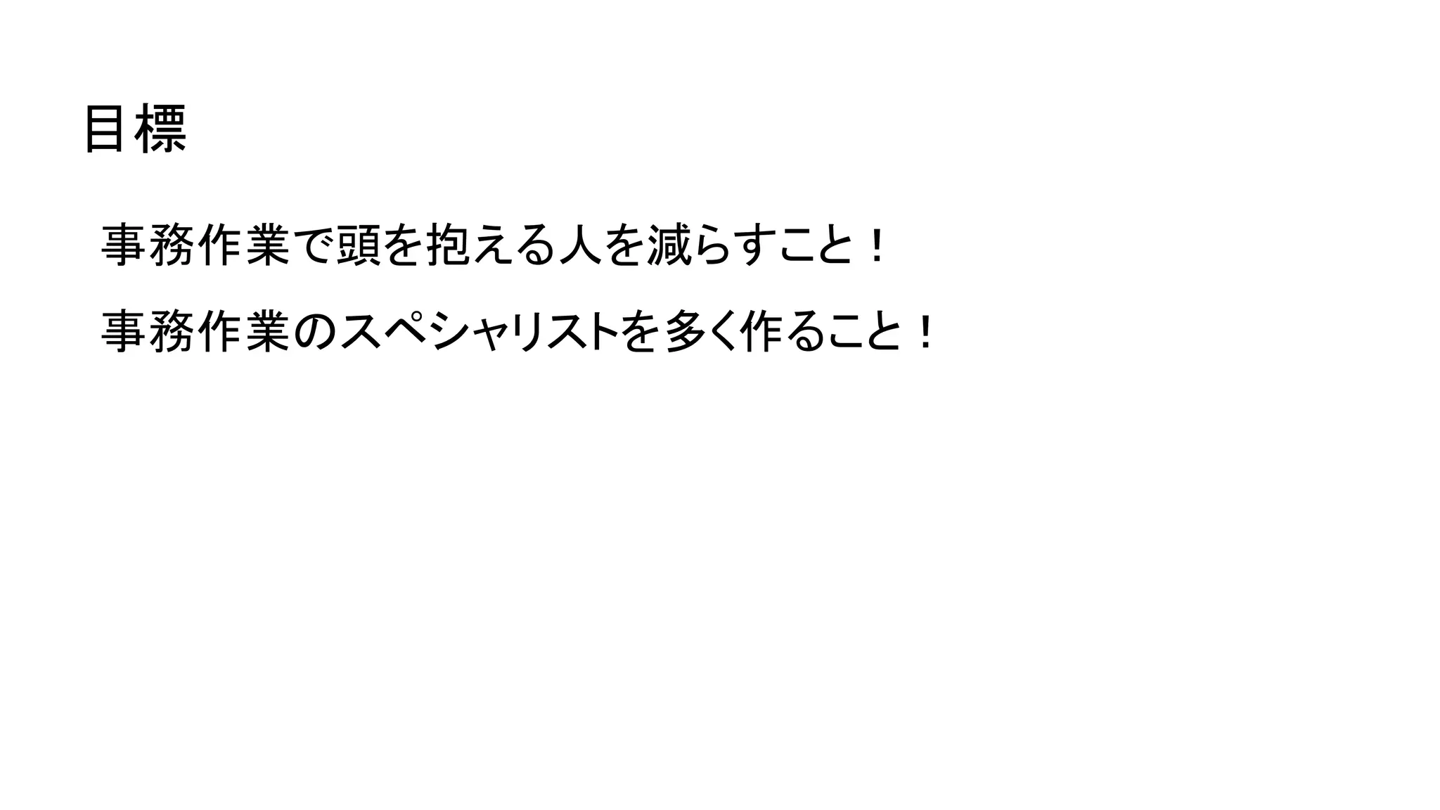 目標 事務作業で頭を抱える人を減らすこと! 事務作業のスペシャリストを多く作ること!