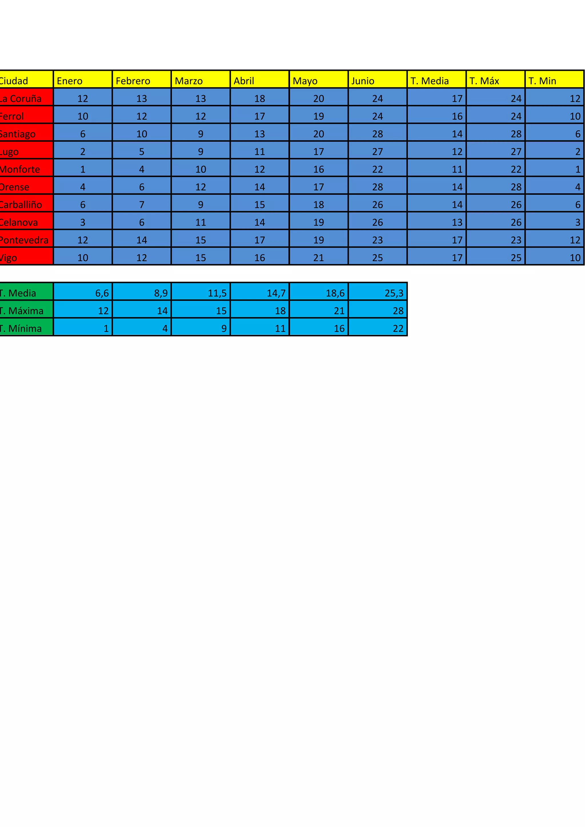 Ciudad Enero FebreroMarzo Abril Mayo Junio T. Media T. Máx T. Min