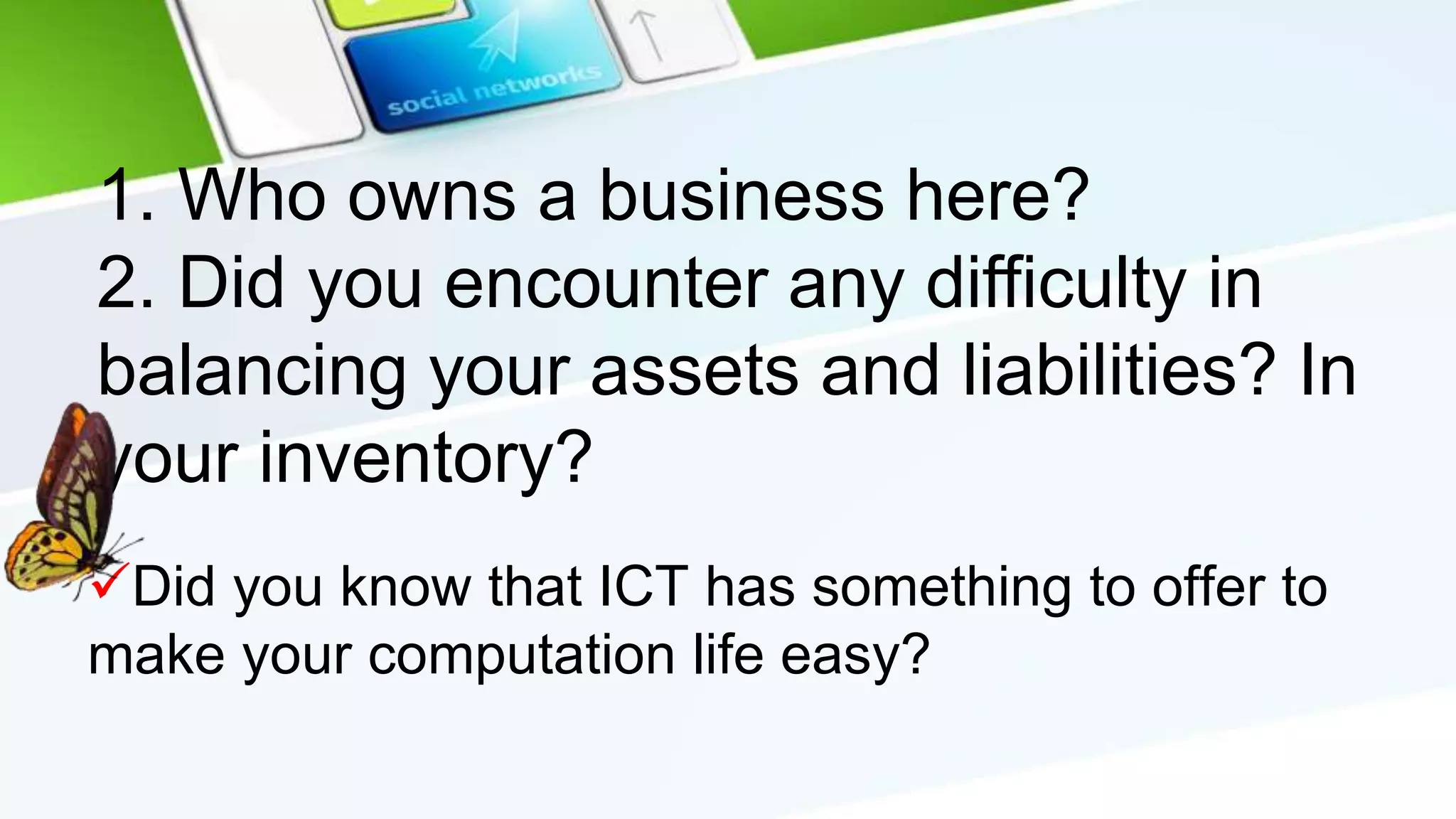 The document discusses advanced formulas and computations in Microsoft Excel. It explains that Excel uses formulas to calculate values, with the equal sign indicating a formula. It also offers predefined functions to make worksheet construction easier. Some common functions are SUM, AVERAGE, MAX, MIN, and COUNT. The document provides examples of formulas using these functions and constants, operators, and cell references. It then has students practice activities using these functions to calculate totals, averages, maximums, minimums, and counts in sample worksheets.