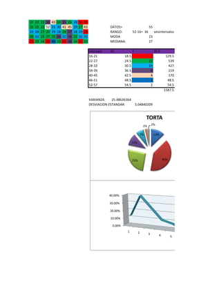 This document contains statistical data and calculations for a data set of numbers ranging from 16 to 57. It includes the mean, median, mode, variance, standard deviation, frequency distribution, and pie chart and bar graph representations. The calculations show the data is normally distributed with a mean of 28.86, median of 27, and mode of 23.