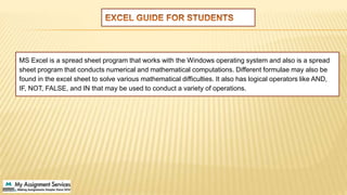 Microsoft Excel is a spreadsheet program primarily used for numerical computations and data analysis, featuring various formulae and logical operators. Students often struggle with Excel assignments due to time constraints and a lack of skills, prompting them to seek help. The program is recognized for its user-friendliness and efficiency in analyzing large data sets quickly.