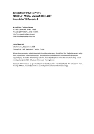 Buku ini adalah buku latihan Microsoft Excel 2007 untuk tingkat SMP/MTS, ditujukan untuk membantu siswa memahami dan menguasai pengolahan angka. Terdapat berbagai modul yang mencakup pengenalan program, penggunaan fungsi dasar dan lanjutan, serta cara membuat dokumen dan grafik. Buku ini disusun dengan tujuan pendidikan tanpa komersial dan sesuai dengan kurikulum nasional.