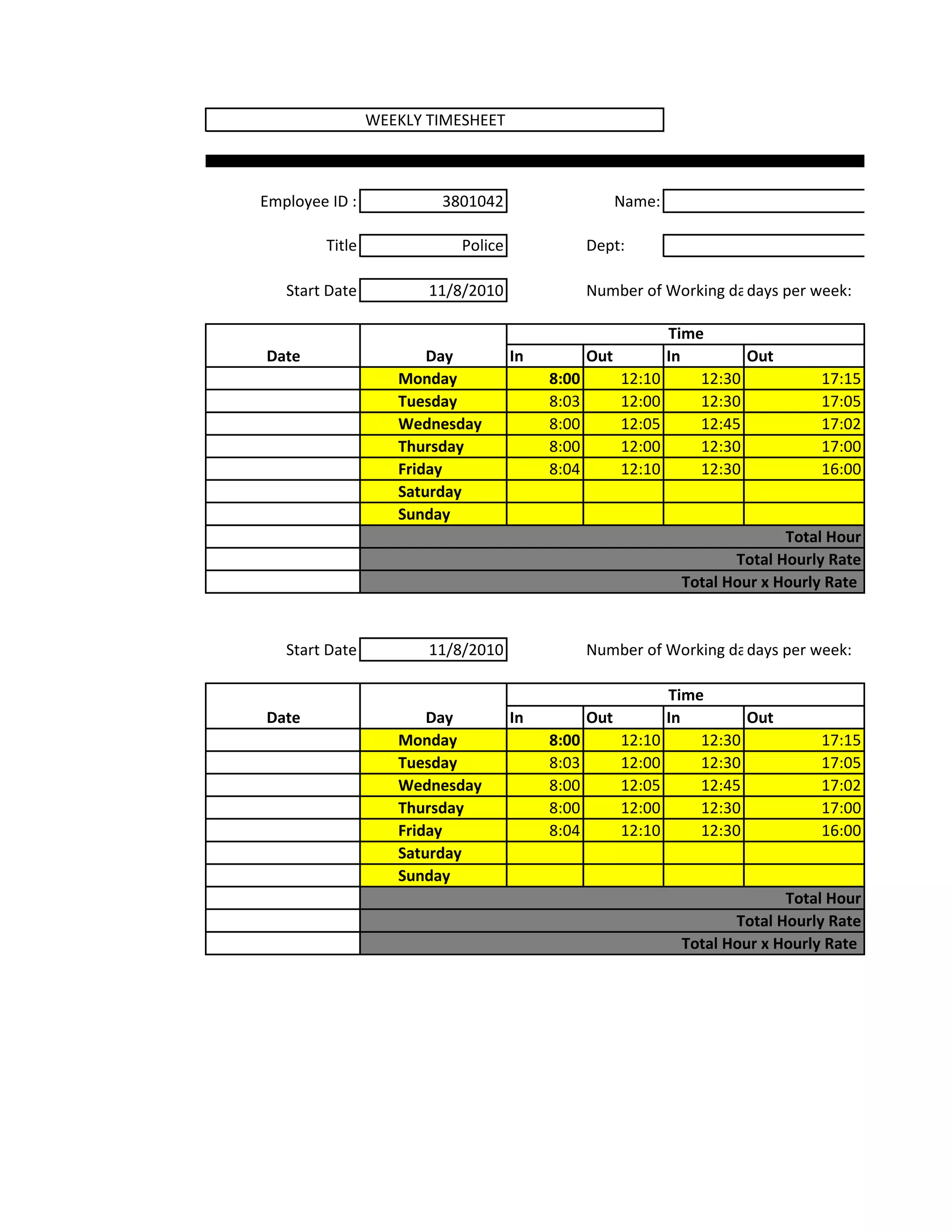The weekly timesheet summarizes Edson m Garza's work hours from Monday to Friday over the course of one week. It lists his employee ID, name, title, department, start date, and number of working days per week. It then details his daily in and out times, total hours worked each day, and his total hours and hourly rate for the week. The monthly budget sheet outlines Edson's monthly income of $2,682.67 in wages. It then lists his monthly expenses across various categories like home, bills, insurance, transportation, health, and personal items, totaling $2,649 for the month. It calculates his total monthly income minus expenses as a balance of $33.67.