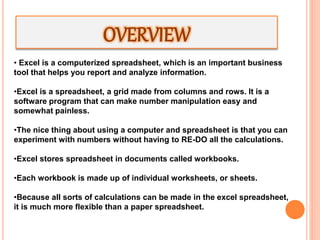 The document provides an overview of Excel as a powerful spreadsheet tool designed for data reporting and analysis, highlighting its structure, components, and functionalities such as data manipulation, formulas, and formatting. It elaborates on essential terms like workbooks, worksheets, cells, and various data types while also explaining common functions like SUM, AVERAGE, and IF, as well as features for filtering, sorting, and conditional formatting. Additionally, the document includes instructions on editing, using tables, and keyboard shortcuts to enhance efficiency in Excel.