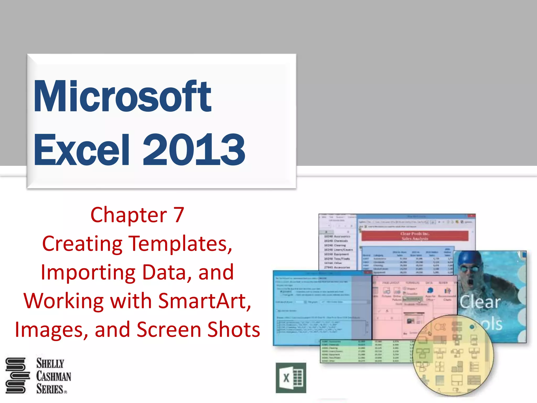 This chapter discusses how to create and use templates, import data from various sources, and work with SmartArt, images, and screen shots in Microsoft Excel 2013. Specifically, it covers how to create and use templates, import data from text files, Access databases, webpages and Word documents, paste data using various paste special options including transposing, convert text to columns, replicate formulas, use the quick analysis tool to format and total data, find and replace data, insert and format charts and SmartArt graphics, add hyperlinked screen shots, and more. The chapter project involves creating a template with sample data and formulas then using it to analyze sales data for a pool cleaning company.