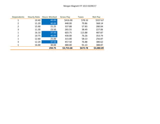 This document contains a payroll report listing employees' hourly rates, hours worked, gross pay, taxes, and net pay. It summarizes that the highest paid employee earned $16.10 per hour, the average pay for 2 employees was $12.94 per hour, and the lowest hourly rate was $10.40. In total, the employees were paid $3,753.68 in gross pay with $672.78 deducted in taxes, resulting in $3,080.89 of net pay.