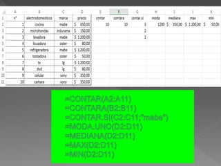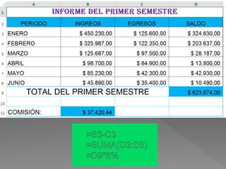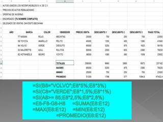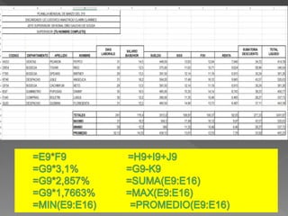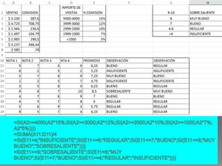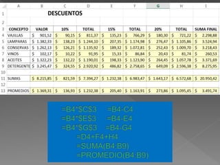 This document contains a series of Excel spreadsheet formulas calculating percentages of cells, multiplying cells, adding cells, averaging a range of cells, and using lookup functions to find values either vertically or horizontally in a range.