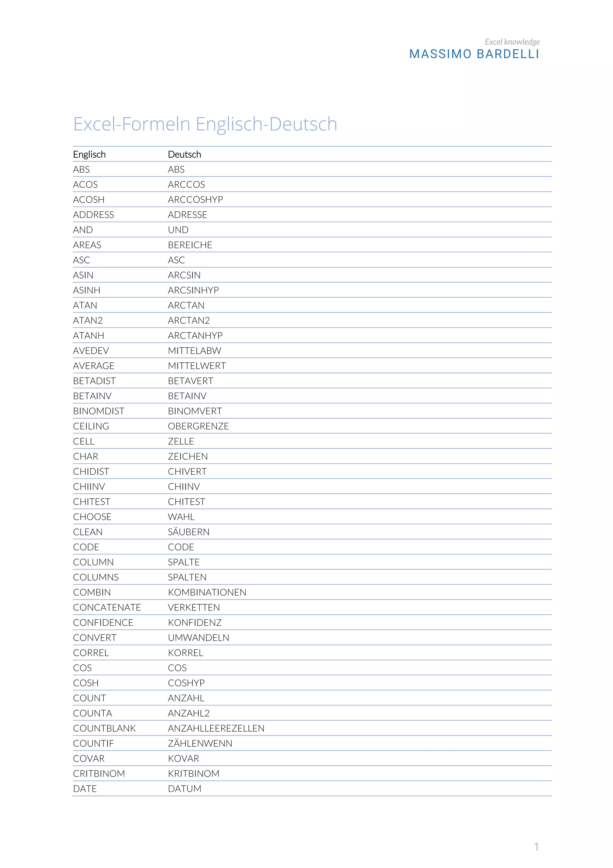 This document contains a table that translates Excel function names between English and German. It lists over 100 Excel functions and their German equivalents. Some examples included are SUM, IF, LEFT, RIGHT, ROUND, COUNT, AVERAGE, MAX, MIN, and more. The table is intended to help users who know Excel functions in one language to easily reference the same function in the other language.