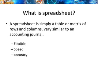 - It defines a spreadsheet as a table of rows and columns like an accounting journal, noting they are flexible, speedy, and accurate.