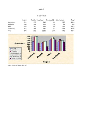 The document shows enrollment numbers by age group for different regions in a childcare program. The Northeast region had the highest total enrollment with 1428 children, while the Midwest had the lowest total of 934 children enrolled. Enrollment was highest in the Preschool 1 age group across all regions.