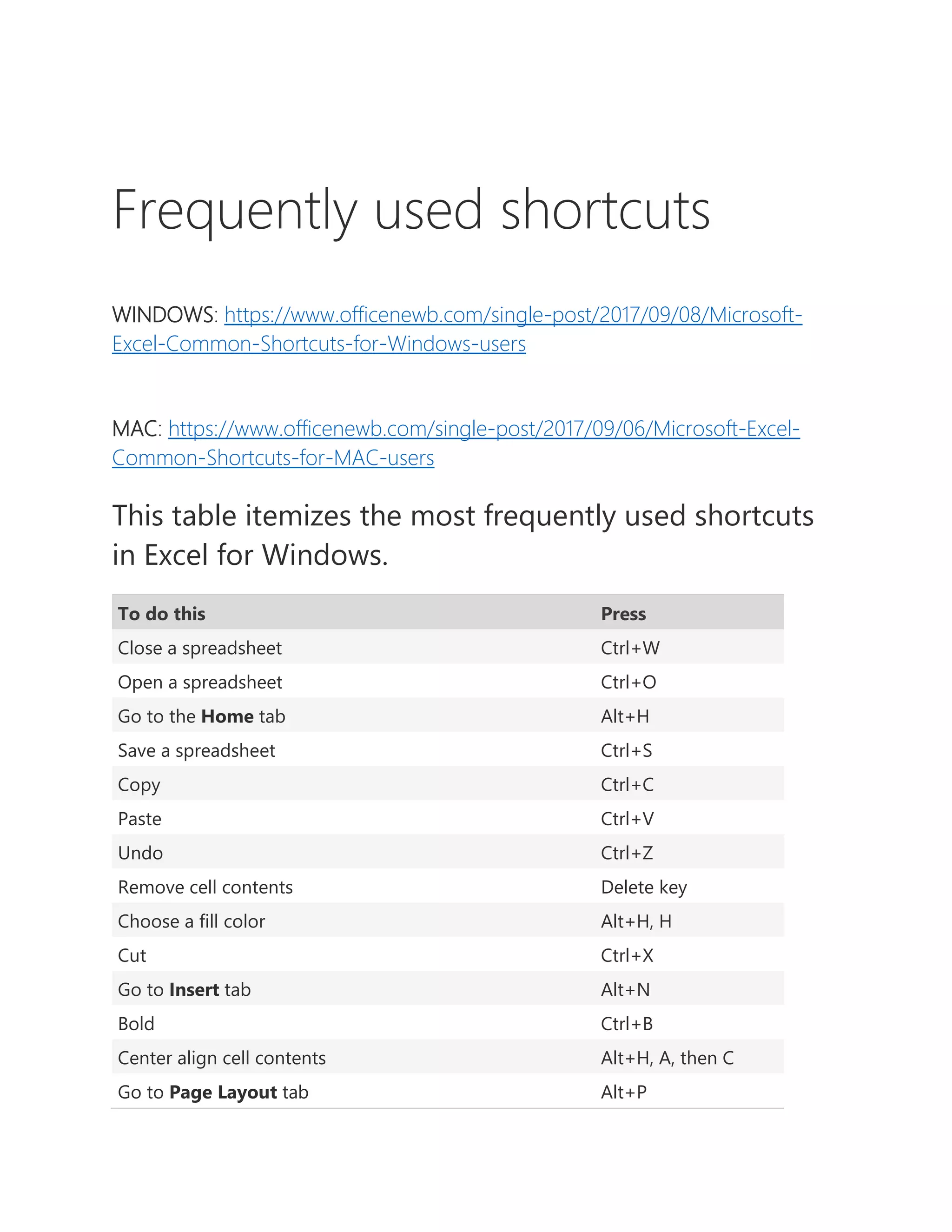 This document lists keyboard shortcuts for Microsoft Excel for both Windows and Mac users. It provides shortcuts for common tasks like closing or opening a spreadsheet, saving, copying, pasting, undoing actions, and changing formatting. Navigation shortcuts are also included for moving between cells, sheets, tabs, and scrolling or paging through a worksheet. Many shortcuts involve using modifier keys like Ctrl, Alt, or Shift in combination with other keys.