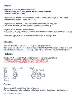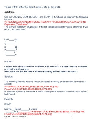 The document provides solutions for common Excel lookup and matching problems using functions like VLOOKUP, INDEX, MATCH, IF, and more. It gives examples of formulas to: