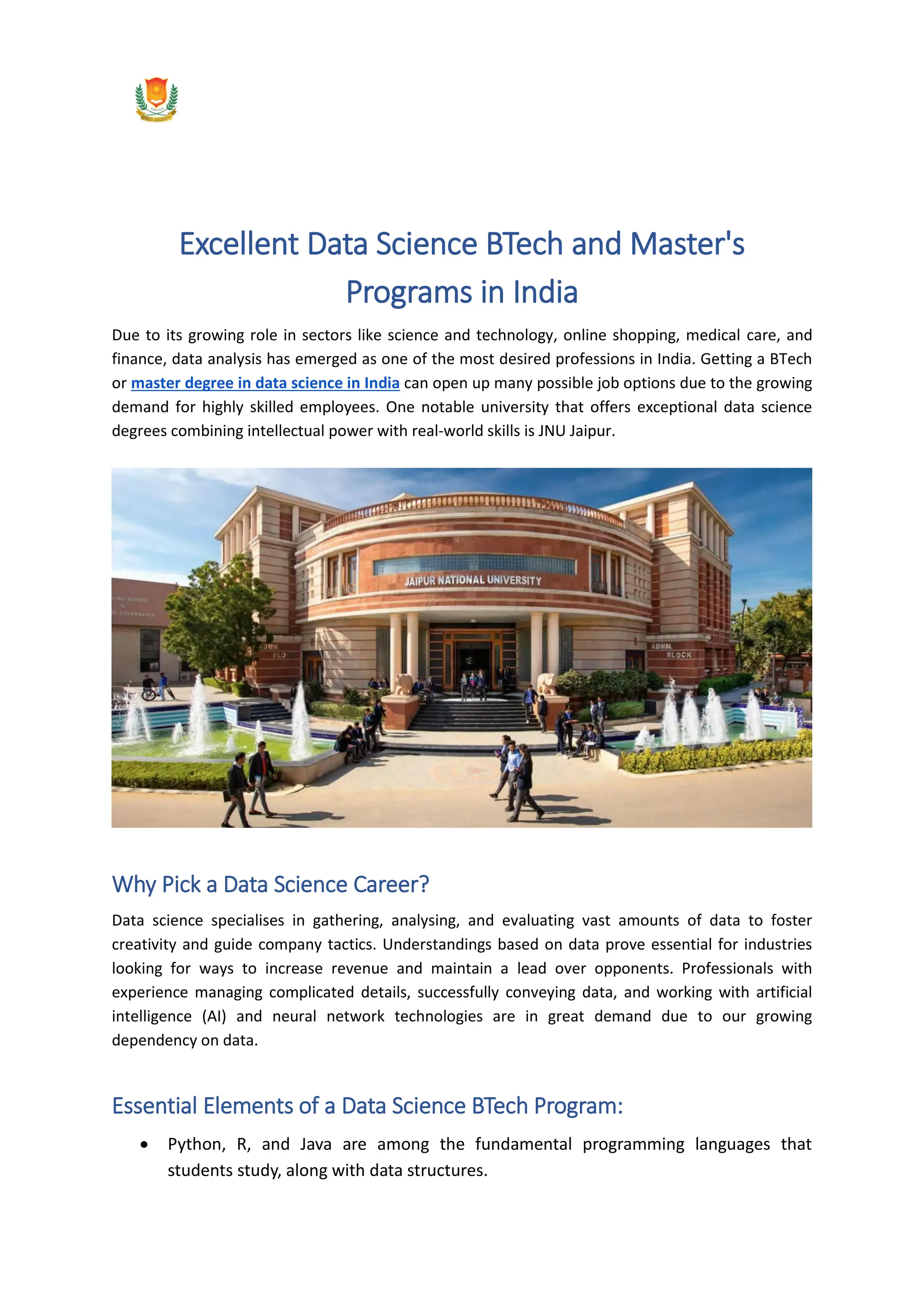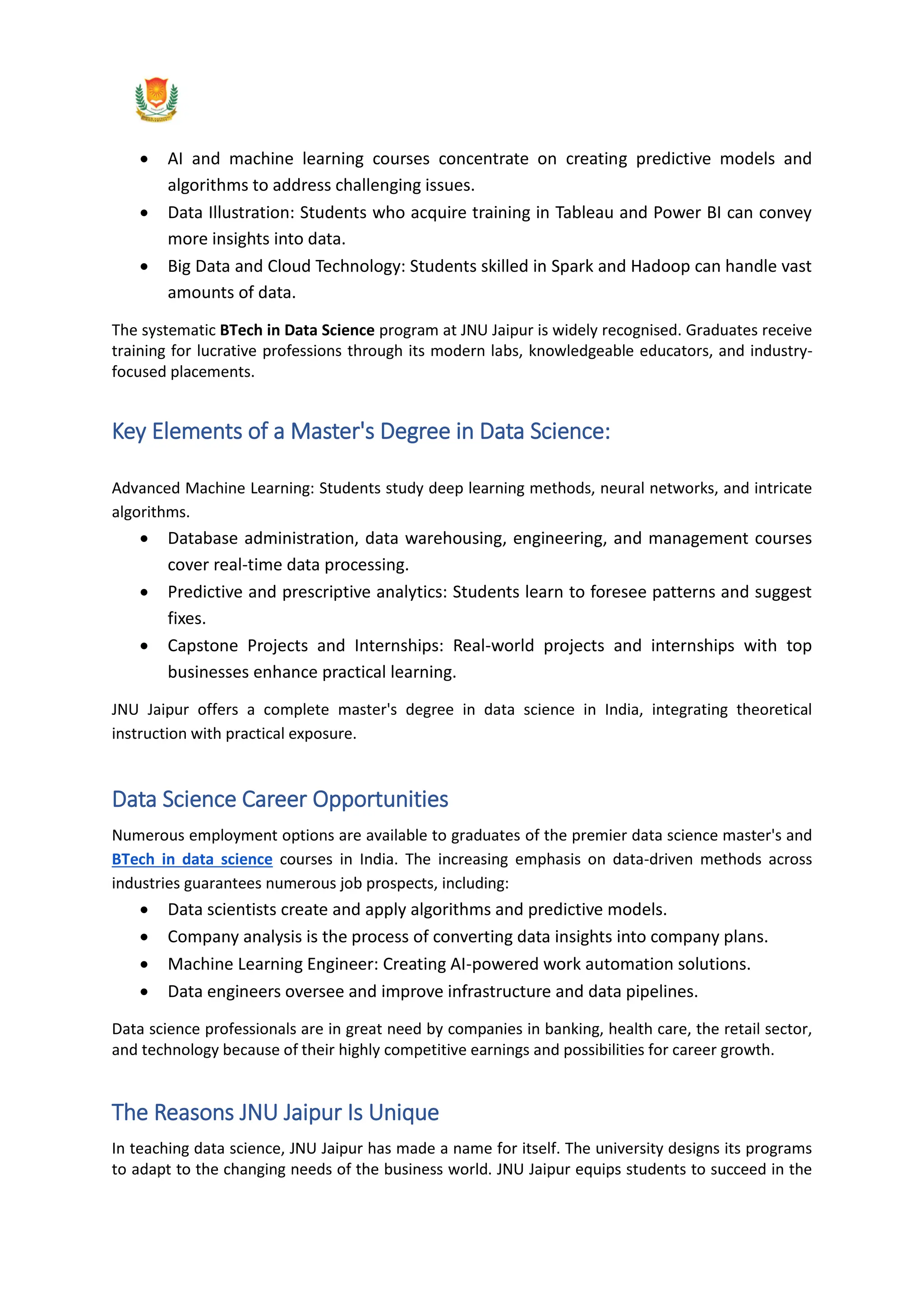 Due to its growing role in sectors like science and technology, online shopping, medical care, and finance, data analysis has emerged as one of the most desired professions in India. Getting a BTech or master degree in data science in India can open up many possible job options due to the growing demand for highly skilled employees. One notable university that offers exceptional data science degrees combining intellectual power with real-world skills is JNU Jaipur.