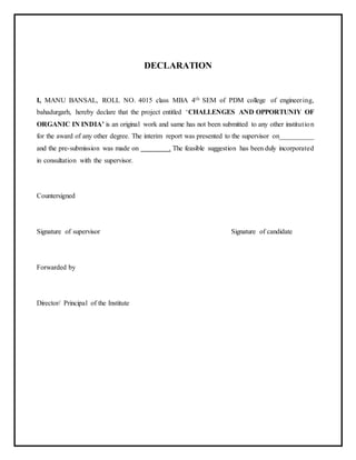 This document is a project report on the challenges and opportunities of organic food in India submitted for a master's degree. It provides an overview of the current organic food market in India, including the growth of organic farming and major crops produced. It also discusses challenges such as the need for education and certification, high certification costs, and lack of infrastructure and processing firms. Contract farming is presented as a way to help small farmers commercialize organic production. The report aims to inform on opportunities and challenges in the domestic and international markets for Indian organic products.