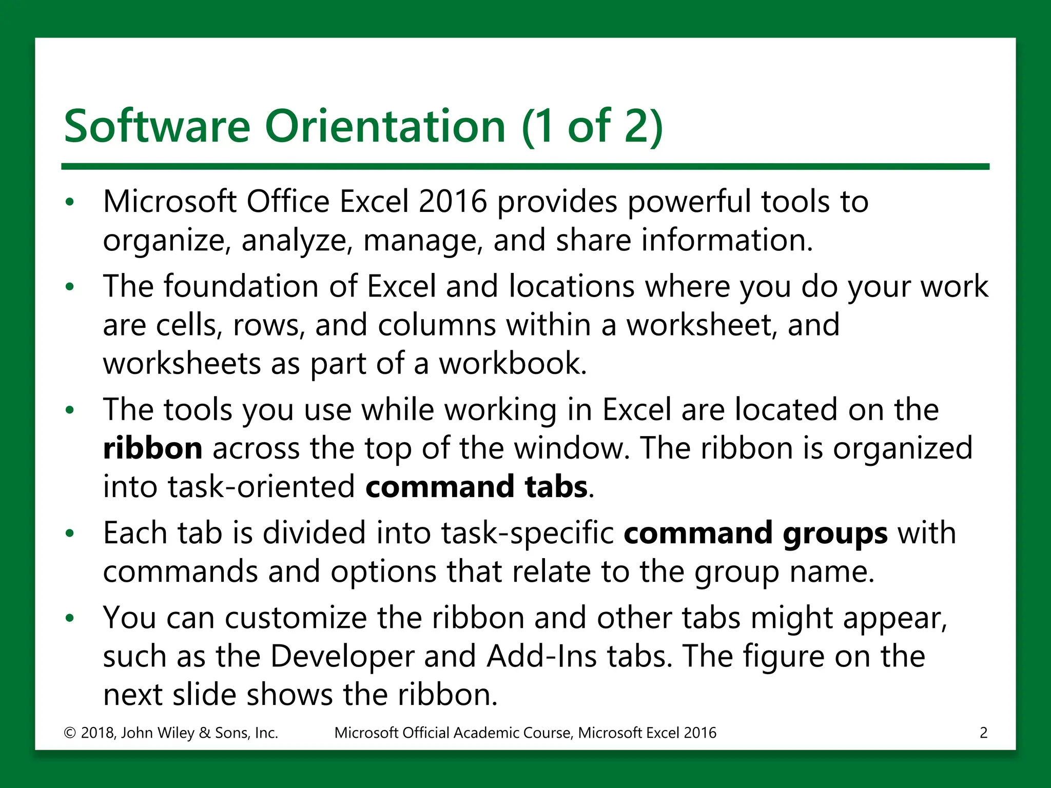 The document provides an overview of Microsoft Excel 2016. It discusses the basic components of Excel including cells, rows, columns, worksheets and workbooks. It describes the ribbon interface and how the ribbon is organized into tabs and groups. It provides step-by-step instructions for starting Excel, opening a blank workbook, customizing the ribbon and quick access toolbar, changing workbook views, splitting windows, and working with existing workbooks. The document is intended to orient users to the Excel interface and basic functions.