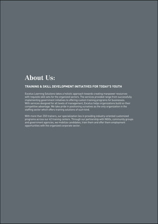 Excelus Learning Solutions focuses on training and skill development for youth, particularly those from rural and underprivileged backgrounds, by offering a range of customized programs across various sectors. With infrastructure capable of training over 25,000 candidates annually and a partnership with government and NGOs, the initiative aims to enhance employability through hands-on vocational courses. Additionally, Excelus' programs are designed to provide businesses with skilled workers, address changing market needs, and improve overall workforce competencies.
