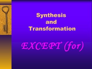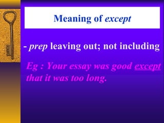 This document provides information and examples on the proper usage of the word "except." It explains that "except" is used to introduce the only thing that is different from the rest. It also discusses how "except" is used after general statements with words like "all" or "every." The document notes common mistakes made with "except," such as using it to change the meaning of a statement, having the wrong verb agreement, or unnecessarily repeating information. Examples are provided to demonstrate the correct usage of "except."