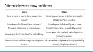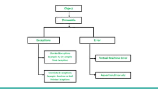 The document discusses exception handling in Java. It defines exceptions as problems that disrupt normal program flow. Exceptions can be caused by invalid user input, file errors, or other issues. Java exceptions are categorized as checked, unchecked, or errors. Checked exceptions must be caught or declared, while unchecked exceptions and errors typically are not. The try-catch block allows catching and handling exceptions. The catch block contains code to handle exceptions thrown in the try block. Exception handling allows programs to continue running after exceptions rather than crashing.