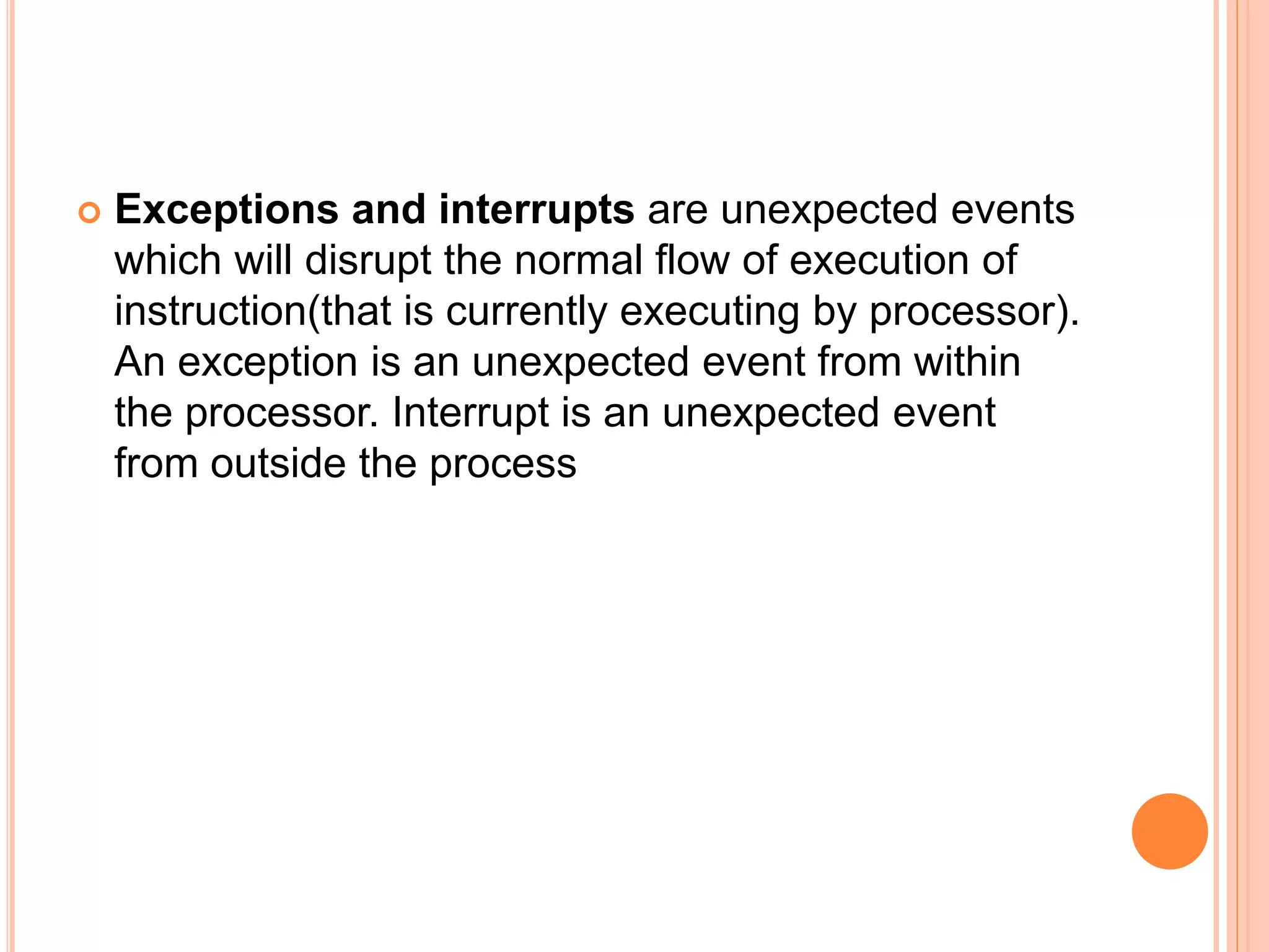 An exception is an unexpected event that occurs within the processor, while an interrupt is an unexpected event from outside the processor. When an exception or interrupt occurs, the hardware executes interrupt handler code in the operating system kernel to handle the event. This may involve killing processes, outputting errors, or communicating with devices. The handler saves the context of the interrupted process, determines the cause, handles the event, then restores the context and resumes execution of either the original or another process.