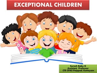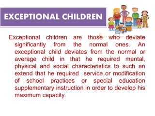 The document elaborates on exceptional children who significantly deviate from the average in physical, intellectual, emotional, or social aspects, thus requiring specialized education and support. It categorizes several types of exceptional children, including gifted, backward, creative, underachievers, learning disabled, mentally retarded, and physically handicapped children, and discusses their characteristics, needs, challenges, and educational strategies. Key educational approaches include specialized instruction, identification through various assessments, and adjustments to teaching methods to cater to the unique needs of these children.