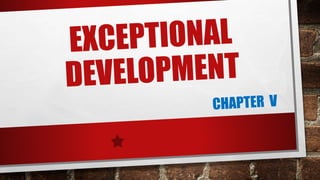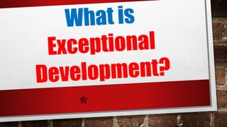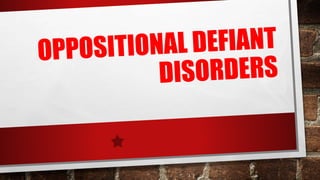 This document outlines a presentation on exceptional development, oppositional defiant disorders, and juvenile delinquency. It includes sections on symptoms and causes, sharing knowledge, evaluation, and a short quiz. The presentation discusses oppositional defiant disorder (ODD) in children, its usual diagnosis by age 8, and common symptoms. Republic Act No. 9344 relates to juvenile justice and welfare in the Philippines. Risk factors for juvenile delinquency mentioned are family environment and peer influences.