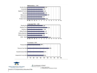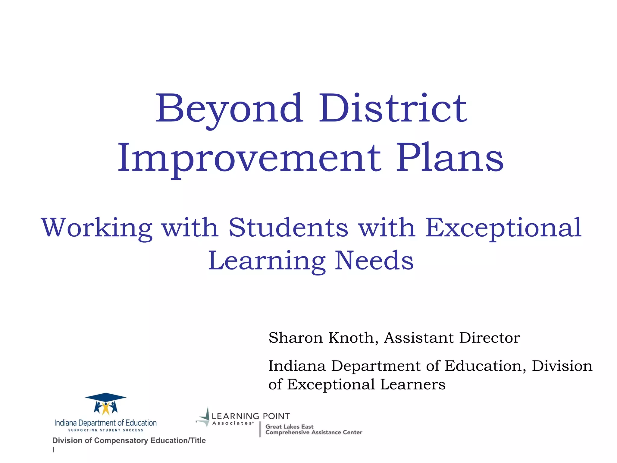 1. The document discusses goals and strategies for supporting students with exceptional learning needs, including analyzing school data, determining priorities, and discussing curriculum, instruction, assessment, and professional development.