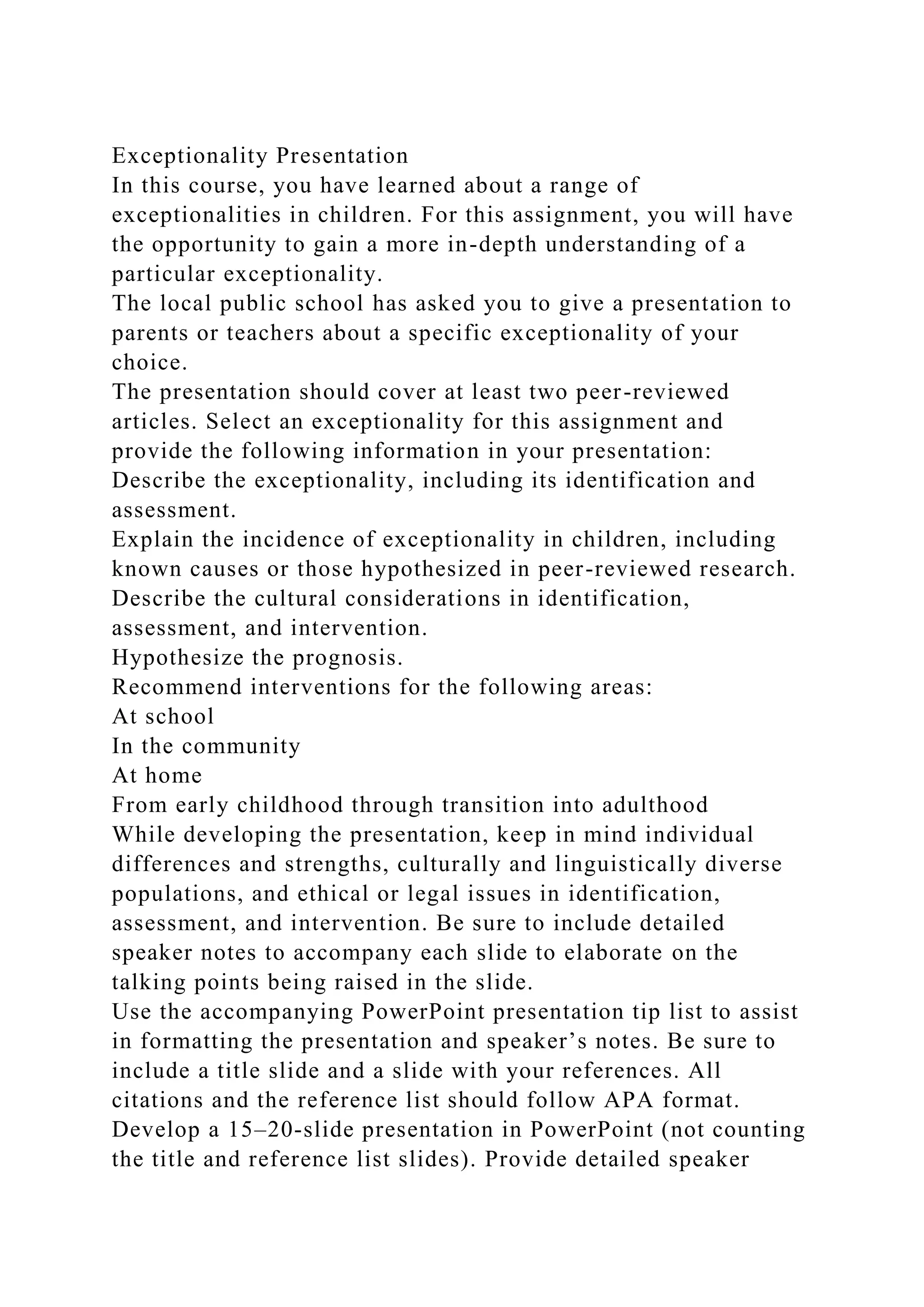 This document outlines an assignment for a presentation on a specific exceptionality in children, requiring an in-depth understanding based on at least two peer-reviewed articles. The presentation must cover identification, incidence, cultural considerations, prognosis, and recommend interventions across various environments, while adhering to APA citation standards. Additionally, detailed speaker notes should accompany each slide for elaboration on the topics discussed.