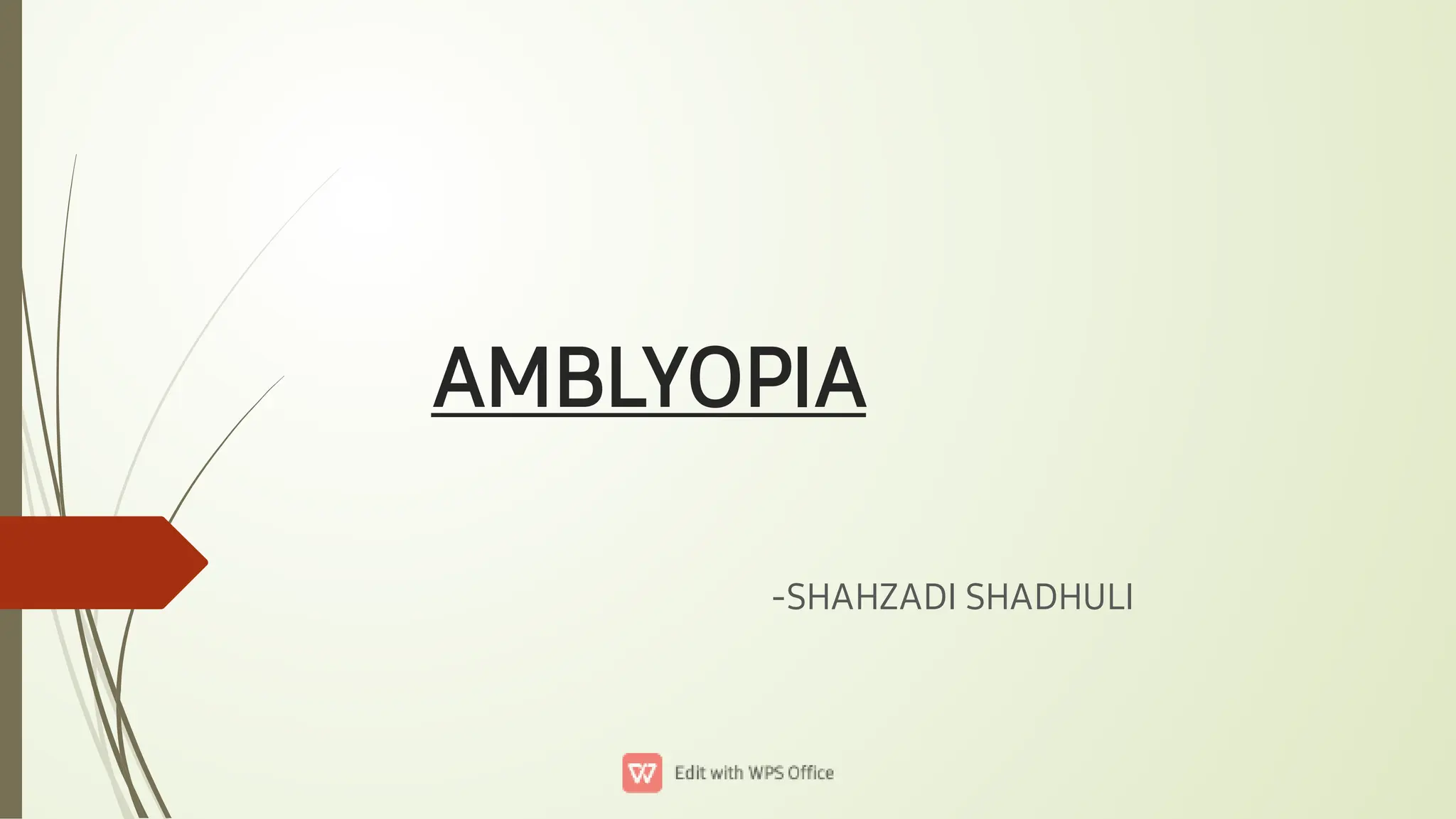 Amblyopia is a partial loss of vision in one or both eyes without any organic disease. It is classified into strabismic amblyopia, refractive amblyopia, and stimulus deprivation amblyopia. Strabismic amblyopia occurs due to squint in one eye leading to less vision. Refractive amblyopia is caused by uncorrected refractive errors such as anisometropia, bilateral ametropia, or meridional astigmatism. Stimulus deprivation amblyopia results from media opacities like cataracts that deprive the eye of visual stimuli early in development. Treatment involves correcting the refractive error or media opacity and occlusion or penalization therapy to force use of the amb