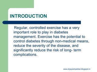 Regular exercise has an important role in diabetes management by helping to control blood sugar levels, improve heart health, aid with weight control, and increase overall well-being. The document recommends aerobic exercise, strength training, and flexibility exercises at a low to moderate intensity for 20-60 minutes, 3-7 times per week depending on the type of diabetes. Guidelines include checking blood sugar levels before exercise, eating a snack beforehand for prolonged sessions, and exercising at the same time each day with consistent intensity levels.