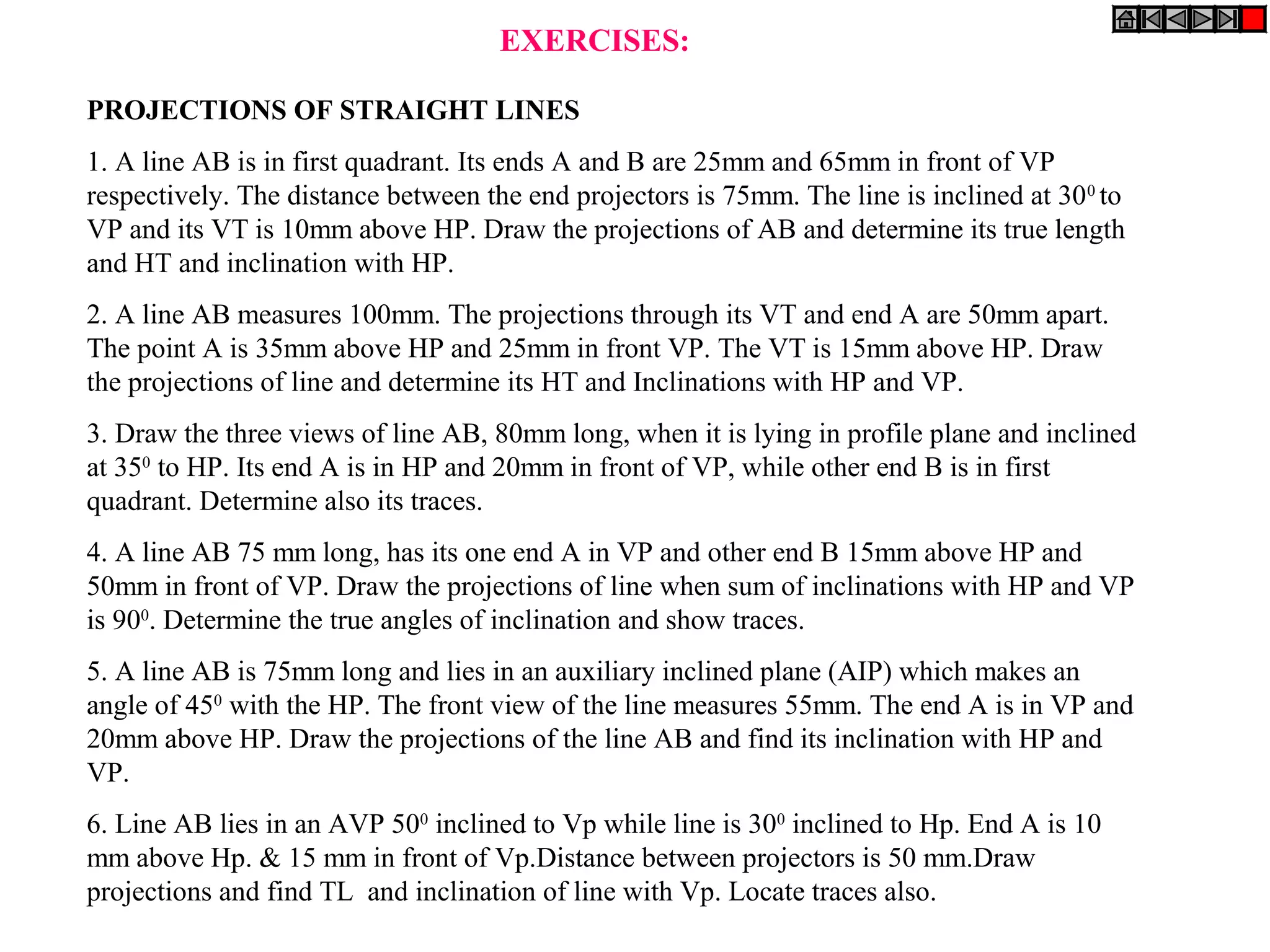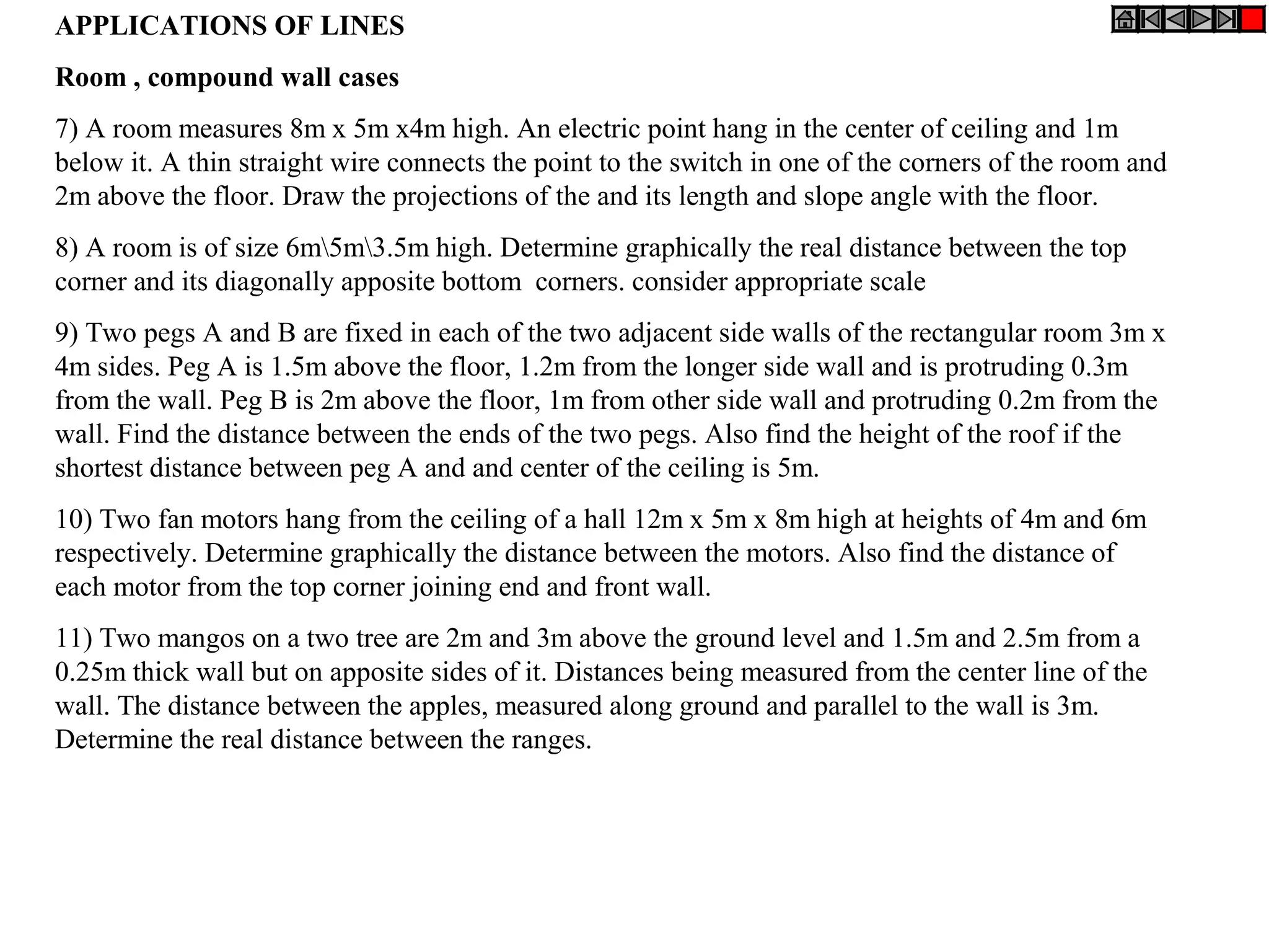 This document provides 6 problems involving the projections of straight lines. The problems involve drawing the projections of lines in different orientations and determining their true lengths, inclinations, and traces. Additional exercises involve applications of lines such as determining distances between points in rooms, between poles, and along roads of varying slopes.
